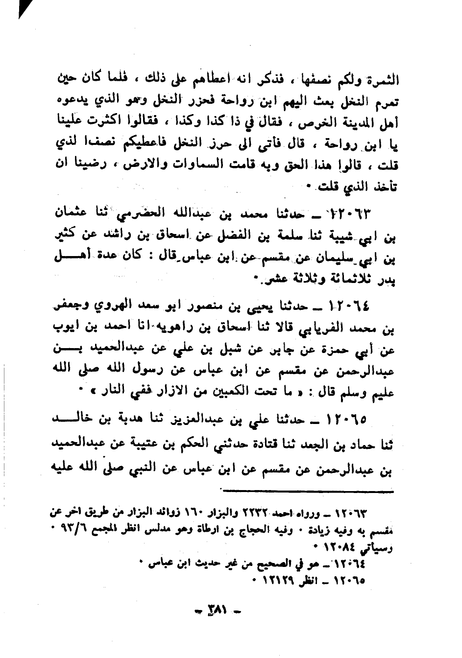 12063 - حَدَّثَنَا مُحَمَّدُ بْنُ عَبْدِ اللهِ الْحَضْرَمِيُّ، ثنا عُثْمَانُ بْنُ أَبِي شَيْبَةَ، ثنا سَلَمَةُ بْنُ الْفَضْلِ، عَنْ إِسْحَاقَ بْنِ رَاشِدٍ، عَنْ كَثِيرِ بْنِ أَبِي سُلَيْمَانَ، عَنْ مِقْسَمٍ، عَنِ ابْنِ عَبَّاسٍ، قَالَ: «كَانَ §عِدَّةُ أَهْلِ بَدْرٍ ثَلَاثَمِائَةٍ وَثَلَاثَةَ عَشَرَ»