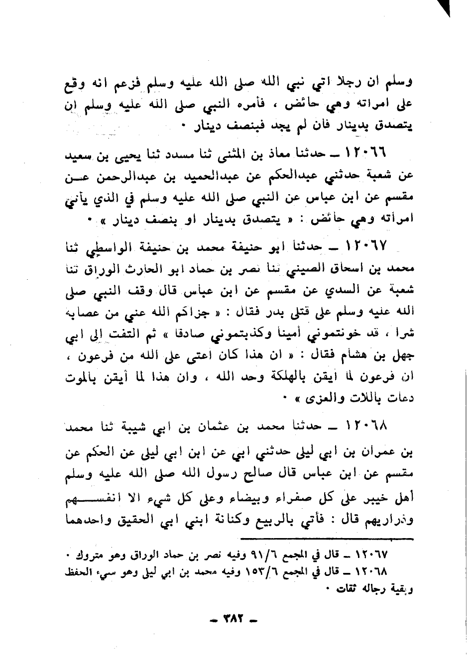 12066 - حَدَّثَنَا مُعَاذُ بْنُ الْمُثَنَّى، ثنا مُسَدَّدٌ، ثنا يَحْيَى بْنُ سَعِيدٍ، عَنْ شُعْبَةَ، حَدَّثَنِي عَبْدُ الْحَكَمِ، عَنْ عَبْدِ الْحَمِيدِ بْنِ عَبْدِ الرَّحْمَنِ، عَنْ مِقْسَمٍ، عَنِ ابْنِ عَبَّاسٍ، عَنِ النَّبِيِّ صَلَّى اللهُ عَلَيْهِ وَسَلَّمَ فِي «§الَّذِي يَأْتِي امْرَأَتَهُ وَهِيَ حَائِضٌ يَتَصَدَّقُ بِدِينَارٍ أَوْ بِنِصْفِ دِينَارٍ»
