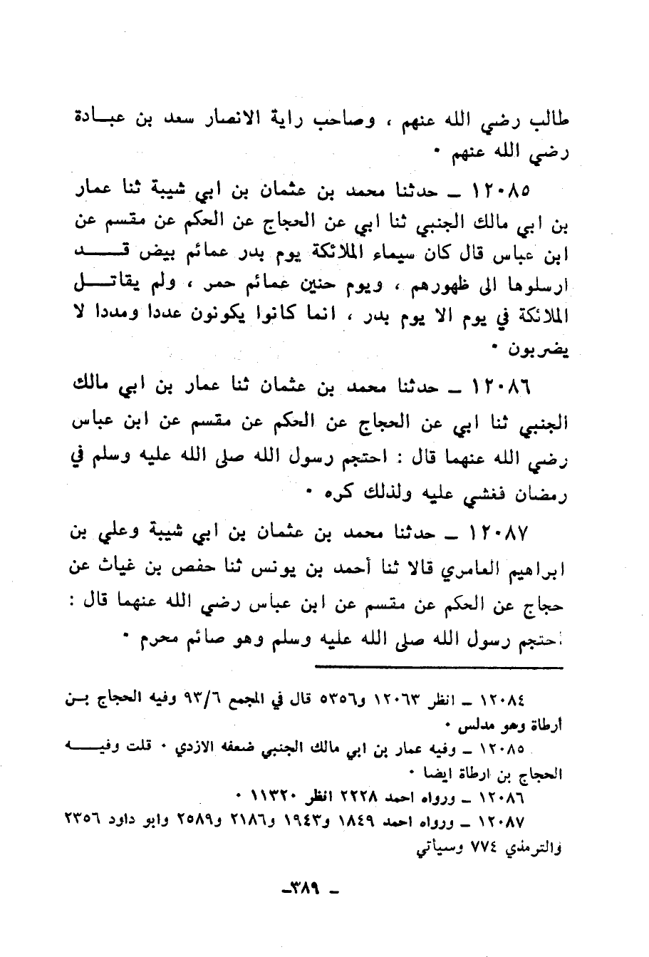 12085 - حَدَّثَنَا مُحَمَّدُ بْنُ عُثْمَانَ بْنِ أَبِي شَيْبَةَ، ثنا عَمَّارُ بْنُ أَبِي مَالِكٍ الْجَنْبِيُّ، ثنا أَبِي، عَنِ الْحَجَّاجِ، عَنِ الْحَكَمِ، عَنْ مِقْسَمٍ، عَنِ ابْنِ عَبَّاسٍ، قَالَ: «كَانَ §سِيمَاءُ الْمَلَائِكَةِ يَوْمَ بَدْرٍ عمائمَ بِيضٍ قَدْ أَرْسَلُوها إِلَى ظُهُورِهِمْ، وَيَوْمَ حُنَيْنٍ عمائمَ حُمْرٍ، وَلَمْ يُقَاتِلِ الْمَلَائِكَةُ فِي يَوْمٍ أَلَا يَوْمَ بَدْرٍ إِنَّمَا كَانُوا يَكُونُونَ عِدَدًا ومَدَدًا لَا يَضْرِبُونَ»