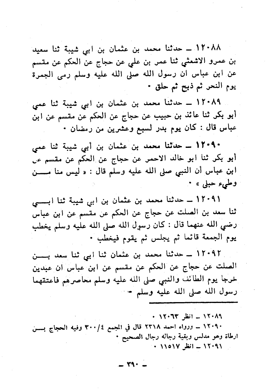 12088 - حَدَّثَنَا مُحَمَّدُ بْنُ عُثْمَانَ بْنِ أَبِي شَيْبَةَ، ثنا سَعِيدُ بْنُ عَمْرٍو الْأَشْعَثِيُّ، ثنا عُمَرُ بْنُ عَلِيٍّ، عَنْ حَجَّاجٍ، عَنِ الْحَكَمِ، عَنْ مِقْسَمٍ، عَنِ ابْنِ عَبَّاسٍ، أَنَّ رَسُولَ اللهِ صَلَّى اللهُ عَلَيْهِ وَسَلَّمَ «§رَمَى الْجَمْرَةَ يَوْمَ النَّحْرِ، ثُمَّ ذَبَحَ، ثُمَّ حَلَقَ»