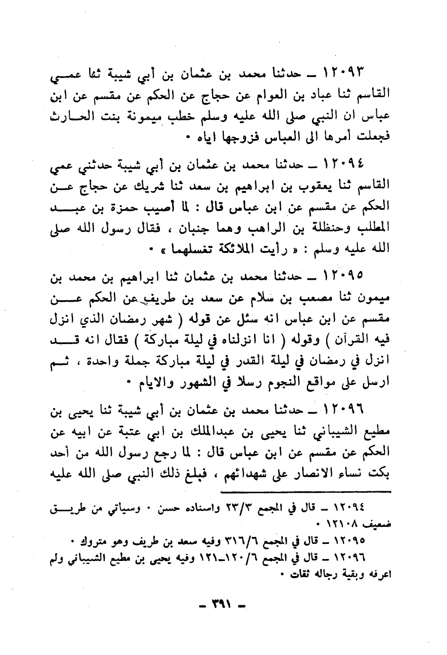 12094 - حَدَّثَنَا مُحَمَّدُ بْنُ عُثْمَانَ بْنِ أَبِي شَيْبَةَ، حَدَّثَنِي عَمِّي الْقَاسِمُ، ثنا يَعْقُوبُ بْنُ إِبْرَاهِيمَ بْنِ سَعْدٍ، ثنا شَرِيكٌ، عَنْ حَجَّاجٍ، عَنِ الْحَكَمِ، عَنْ مِقْسَمٍ، عَنِ ابْنِ عَبَّاسٍ، قَالَ: لَمَّا أُصِيبَ حَمْزَةُ بْنُ عَبْدِ الْمُطَّلِبِ وَحَنْظَلَةُ بْنُ الرَّاهِبِ وَهُمَا جُنُبَانِ فَقَالَ رَسُولُ اللهِ صَلَّى اللهُ عَلَيْهِ وَسَلَّمَ: «§رَأَيْتُ الْمَلَائِكَةَ تُغَسِّلُهُمَا»