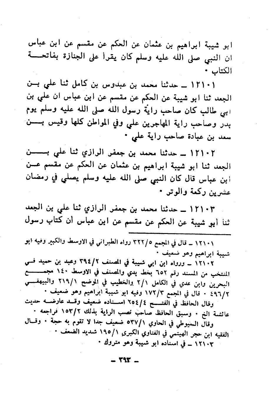 12102 - حَدَّثَنَا مُحَمَّدُ بْنُ جَعْفَرٍ الرَّازِيُّ، ثنا عَلِيُّ بْنُ الْجَعْدِ، ثنا أَبُو شَيْبَةَ إِبْرَاهِيمُ بْنُ عُثْمَانَ، عَنِ الْحَكَمِ، عَنْ مِقْسَمٍ، عَنِ ابْنِ عَبَّاسٍ، قَالَ: كَانَ النَّبِيُّ صَلَّى اللهُ عَلَيْهِ وَسَلَّمَ «§يُصَلِّي فِي رَمَضَانَ عِشْرِينَ رَكْعَةً وَالْوِتْرَ»