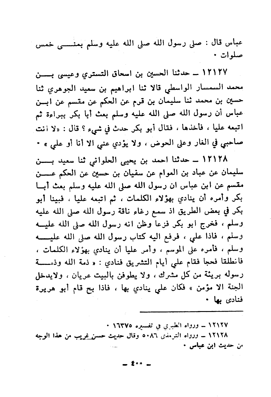 12128 - حَدَّثَنَا أَحْمَدُ بْنُ يَحْيَى الْحُلْوَانِيُّ، ثنا سَعِيدُ بْنُ سُلَيْمَانَ، عَنْ عَبَّادِ بْنِ الْعَوَّامِ، عَنْ سُفْيَانَ بْنِ حُسَيْنٍ، عَنِ الْحَكَمِ، عَنْ مِقْسَمٍ، عَنِ ابْنِ عَبَّاسٍ، أَنَّ رَسُولَ اللهِ صَلَّى اللهُ عَلَيْهِ وَسَلَّمَ بَعَثَ أَبَا بَكْرٍ وَأَمَرَهُ أَنْ يُنَادِيَ بِهَؤُلَاءِ الْكَلِمَاتِ، ثُمَّ أَتْبَعَهُ عَلِيًّا فَبَيْنَا أَبُو بَكْرٍ فِي بَعْضِ الطَّرِيقِ إِذْ سَمِعَ رُغَاءَ نَاقَةِ رَسُولِ اللهِ صَلَّى اللهُ عَلَيْهِ وَسَلَّمَ، فَخَرَجَ أَبُو بَكْرٍ فَزِعًا، وَظَنَّ أَنَّهُ رَسُولُ اللهِ صَلَّى اللهُ عَلَيْهِ وَسَلَّمَ، فَإِذَا عَلِيٌّ فَرَفَعَ إِلَيْهِ كِتَابَ رَسُولِ اللهِ صَلَّى اللهُ عَلَيْهِ وَسَلَّمَ، فَأَمَرَهُ عَلَى الْمَوْسِمِ، وَأَمَرَ عَلِيًّا أَنْ يُنَادِيَ بِهَؤُلَاءِ الْكَلِمَاتِ فَانْطَلَقَا فَحَجَّا، فَقَامَ عَلِيٌّ أَيَّامَ التَّشْرِيقِ فَنَادَى: «§ذِمَّةُ اللهِ وَذِمَّةُ رَسُولِهِ بَرِيئَةٌ مِنْ كُلِّ مُشْرِكٍ، فَسِيحُوا فِي الْأَرْضِ أَرْبَعَةَ أَشْهُرٍ، وَلَا يَحُجَّنَّ بَعْدَ الْعَامِ مُشْرِكٌ، وَلَا يَطُوفَنَّ بِالْبَيْتِ عُرْيَانٌ، وَلَا يَدْخُلُ الْجَنَّةَ إِلَّا مُؤْمِنٌ» ، فَكَانَ عَلِيٌّ يُنَادِي بِهَا فَإِذَا بُحَّ قَامَ أَبُو هُرَيْرَةَ فَنَادَى بِهَا