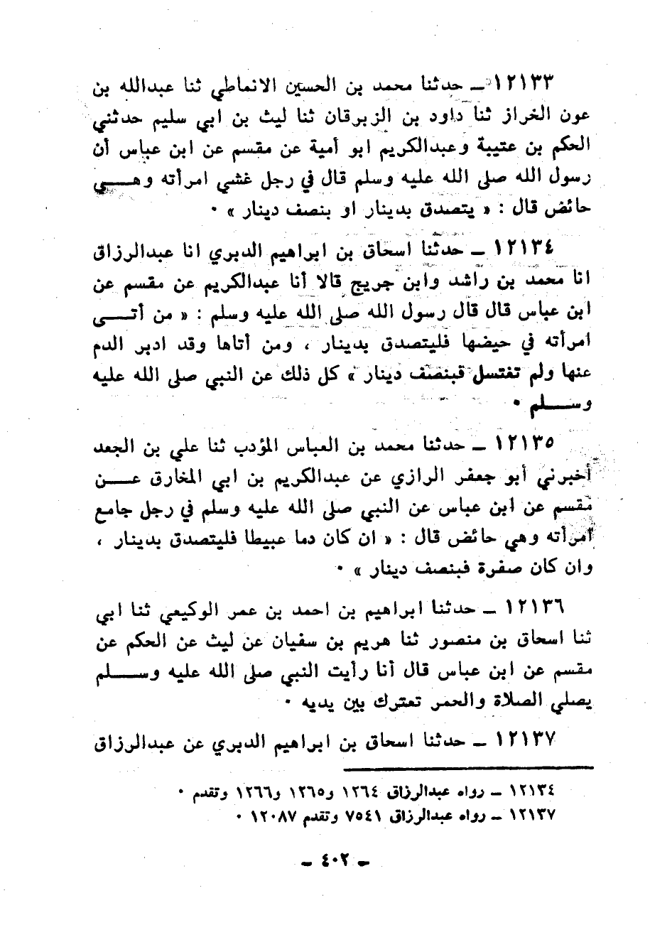 12134 - حَدَّثَنَا إِسْحَاقُ بْنُ إِبْرَاهِيمَ الدَّبَرِيُّ، أَنَا عَبْدُ الرَّزَّاقِ، أَنَا مُحَمَّدُ بْنُ رَاشِدٍ، وَابْنُ جُرَيْجٍ، قَالَا: أَنَا عَبْدُ الْكَرِيمِ، عَنْ مِقْسَمٍ، عَنِ ابْنِ عَبَّاسٍ، قَالَ: قَالَ رَسُولُ اللهِ صَلَّى اللهُ عَلَيْهِ وَسَلَّمَ: «§مَنْ أَتَى امْرَأَتَهُ فِي حَيْضِهَا فَلْيَتَصَدَّقْ بِدِينَارٍ، وَمَنْ أَتَاهَا وَقَدْ أَدْبَرَ الدَّمُ عَنْهَا وَلَمْ تَغْتَسِلْ فَبِنِصْفِ دِينَارٍ» كُلُّ ذَلِكَ عَنِ النَّبِيِّ صَلَّى اللهُ عَلَيْهِ وَسَلَّمَ