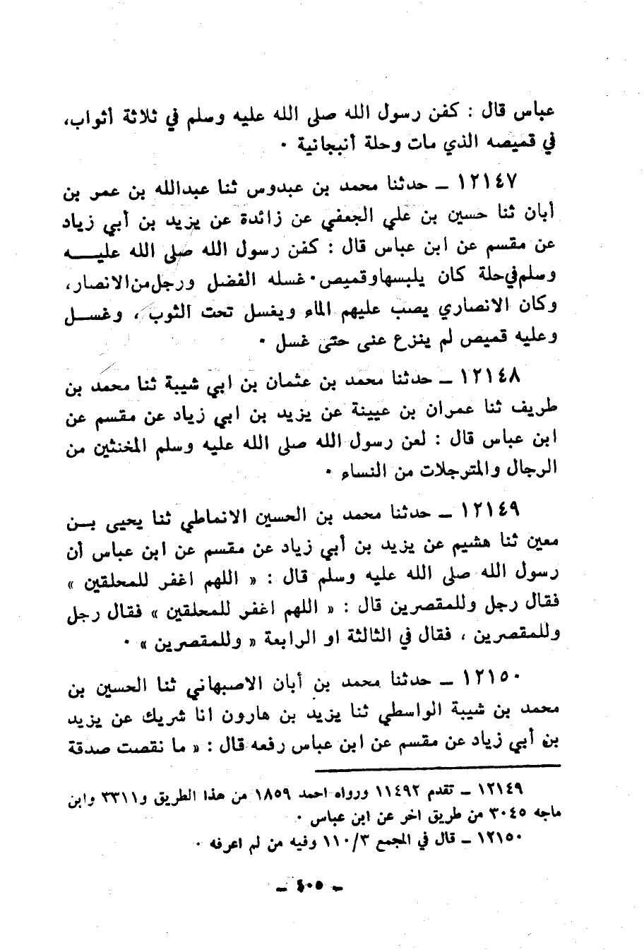 12147 - حَدَّثَنَا مُحَمَّدُ بْنُ عَبْدُوسٍ، ثنا عَبْدُ اللهِ بْنُ عُمَرَ بْنِ أَبَانَ، ثنا حُسَيْنُ بْنُ عَلِيٍّ الْجُعْفِيُّ، عَنْ زَائِدَةَ، عَنْ يَزِيدَ بْنِ أَبِي زِيَادٍ، عَنْ مِقْسَمٍ، عَنِ ابْنِ عَبَّاسٍ، قَالَ: «§كُفِّنَ رَسُولُ اللهِ صَلَّى اللهُ عَلَيْهِ وَسَلَّمَ فِي حُلَّةٍ كَانَ يَلْبَسُهَا وَقَمِيصٍ، غَسَّلَهُ الْفَضْلُ وَرَجُلٌ مِنَ الْأَنْصَارِ، وَكَانَ الْأَنْصَارِيُّ يَصُبُّ عَلَيْهِمُ الْمَاءَ، وَيَغْسِلُ تَحْتَ الثَّوْبِ، وَغُسِّلَ وَعَلَيْهِ قَمِيصٌ لَمْ يُنْزَعْ عَنْهُ حَتَّى غُسِّلَ»