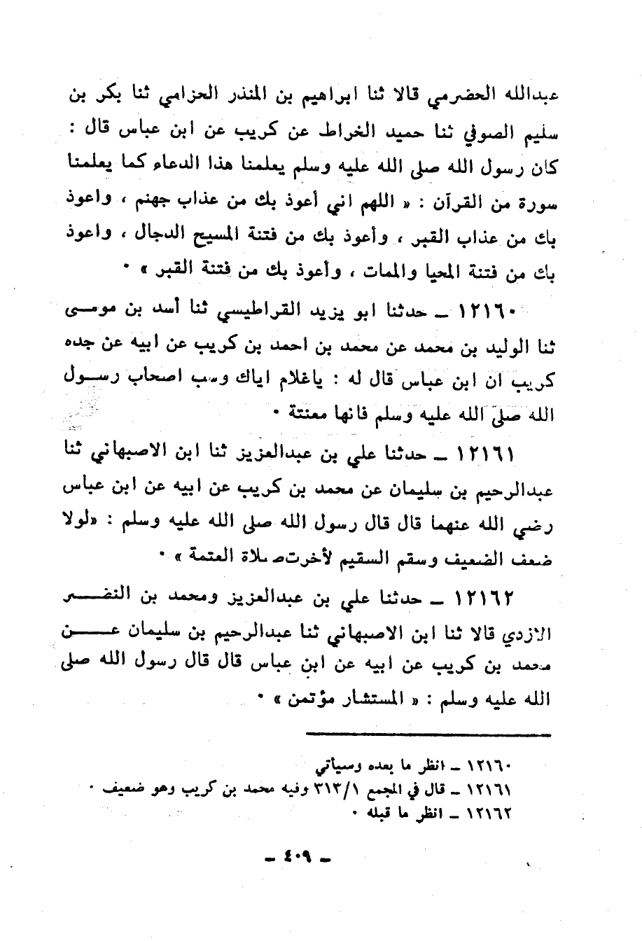 12160 - حَدَّثَنَا أَبُو يَزِيدَ الْقراطيسيُّ، ثنا أَسَدُ بْنُ مُوسَى، ثنا الْوَلِيدُ بْنُ مُحَمَّدٍ، عَنْ مُحَمَّدِ بْنِ أَحْمَدَ بْنِ كُرَيْبٍ، عَنْ أَبِيهِ، عَنْ جَدِّهِ كُرَيْبٍ، أَنَّ ابْنَ عَبَّاسٍ، قَالَ لَهُ: «يَا غُلَامُ، §إِيَّاكَ وَسَبَّ أَصْحَابِ رَسُولِ اللهِ صَلَّى اللهُ عَلَيْهِ وَسَلَّمَ فَإِنَّهَا مُعْنِتَةٌ»