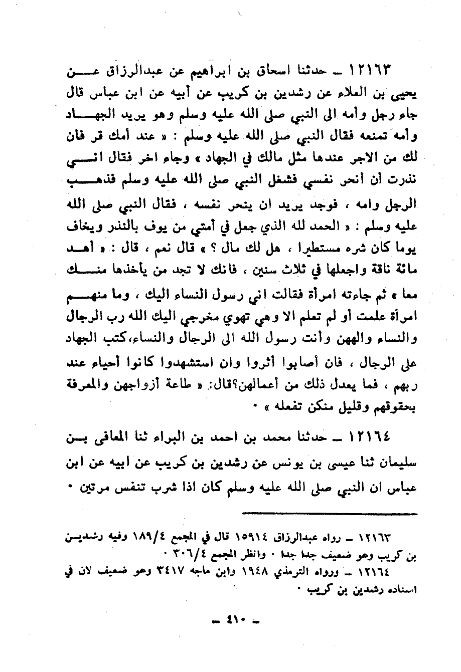 12163 - حَدَّثَنَا إِسْحَاقُ بْنُ إِبْرَاهِيمَ، عَنْ عَبْدِ الرَّزَّاقِ، عَنْ يَحْيَى بْنِ الْعَلَاءِ، عَنْ رِشْدِينَ بْنِ كُرَيْبٍ، عَنْ أَبِيهِ، عَنِ ابْنِ عَبَّاسٍ، قَالَ: جَاءَ رَجُلٌ وَأُمُّهُ إِلَى النَّبِيِّ صَلَّى اللهُ عَلَيْهِ وَسَلَّمَ وَهُوَ يُرِيدُ الْجِهَادَ وَأُمُّهُ تَمْنَعُهُ، فَقَالَ النَّبِيُّ صَلَّى اللهُ عَلَيْهِ وَسَلَّمَ: «§عِنْدَ أُمِّكَ قَرَّ فَإِنَّ لَكَ مِنَ الْأَجْرِ عِنْدَهَا مِثْلَ مَا لَكَ فِي الْجِهَادِ»