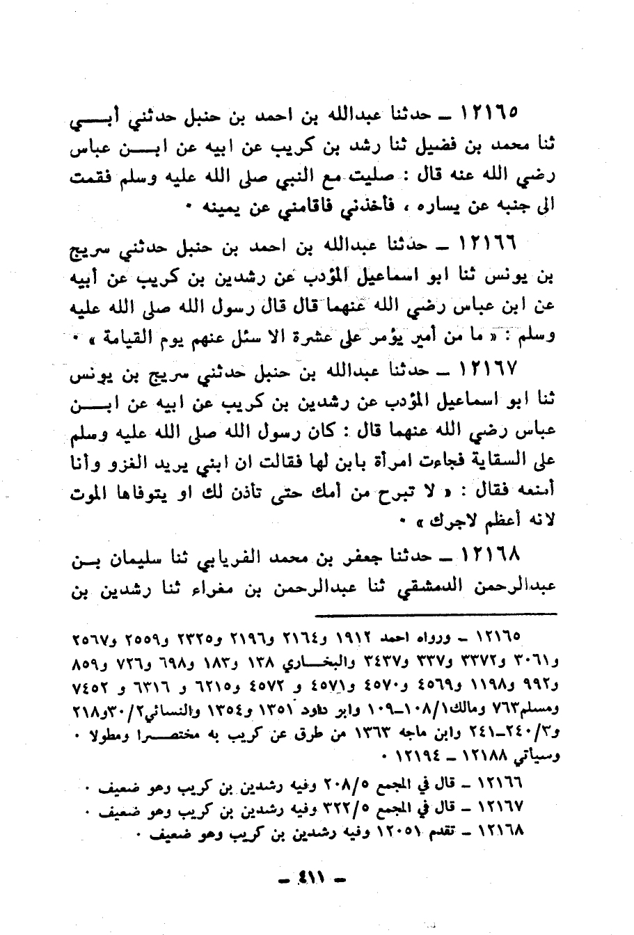 12166 - حَدَّثَنَا عَبْدُ اللهِ بْنُ أَحْمَدَ بْنِ حَنْبَلٍ، حَدَّثَنِي سُرَيْجُ بْنُ يُونُسَ، ثنا أَبُو إِسْمَاعِيلَ الْمُؤَدِّبُ، عَنْ رِشْدِينَ بْنِ كُرَيْبٍ، عَنْ أَبِيهِ، عَنِ ابْنِ عَبَّاسٍ رَضِي اللهُ عَنْهُمَا، قَالَ: قَالَ رَسُولُ اللهِ صَلَّى اللهُ عَلَيْهِ وَسَلَّمَ: «§مَا مِنْ أَمِيرٍ يُؤَمَّرُ عَلَى عَشَرَةٍ إِلَّا سُئِلَ عَنْهُمْ يَوْمَ الْقِيَامَةِ»