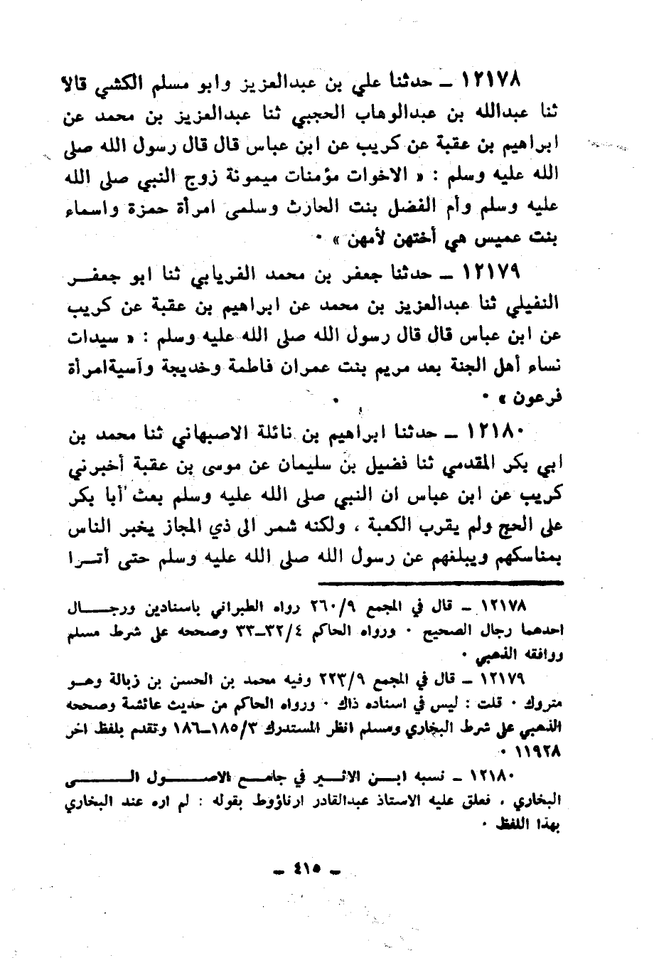12179 - حَدَّثَنَا جَعْفَرُ بْنُ مُحَمَّدٍ الْفِرْيَابِيُّ، ثنا أَبُو جَعْفَرٍ النُّفَيْلِيُّ، ثنا عَبْدُ الْعَزِيزِ بْنُ مُحَمَّدٍ، عَنْ إِبْرَاهِيمَ بْنِ عُقْبَةَ، عَنْ كُرَيْبٍ، عَنِ ابْنِ عَبَّاسٍ، قَالَ: قَالَ رَسُولُ اللهِ صَلَّى اللهُ عَلَيْهِ وَسَلَّمَ: «§سَيِّداتُ نِسَاءِ أَهْلِ الْجَنَّةِ بَعْدَ مَرْيَمَ بِنْتِ عِمْرَانَ، فَاطِمَةُ، وَخَدِيجَةُ، وَآسِيَةُ امْرَأَةُ فِرْعَوْنَ»