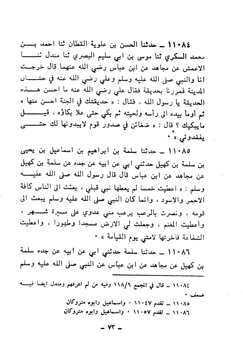 11085 - حَدَّثَنَا سَلَمَةُ بْنُ إِبْرَاهِيمَ بْنِ إِسْمَاعِيلَ بْنِ يَحْيَى بْنِ سَلَمَةَ بْنِ كُهَيْلٍ، حَدَّثَنِي أَبِي، عَنْ أَبِيهِ، عَنْ جَدِّهِ، عَنْ سَلَمَةَ بْنِ كُهَيْلٍ، عَنْ مُجَاهِدٍ، عَنِ ابْنِ عَبَّاسٍ، قَالَ: قَالَ رَسُولُ اللهِ صَلَّى اللهُ عَلَيْهِ وَسَلَّمَ: " §أُعْطِيتُ خَمْسًا لَمْ يُعْطَهَا نَبِيٌّ قَبْلِي: بُعِثْتُ إِلَى النَّاسِ كَافَّةً الْأَحْمَرِ وَالْأَسْوَدِ وَإِنَّمَا كَانَ النَّبِيُّ صَلَّى اللهُ عَلَيْهِ وَسَلَّمَ يُبْعَثُ إِلَى قَوْمِهِ، وَنُصِرْتُ بِالرُّعْبِ يُرْعَبُ مِنِّي عَدُوِّي عَلَى مَسِيرَةِ شَهْرٍ، وَأُعْطِيتُ الْمَغْنَمَ، وَجُعِلَتْ لِي الْأَرْضُ مَسْجِدًا وَطَهُورًا، وَأُعْطِيتُ الشَّفَاعَةَ فَأَخَّرْتُهَا لِأُمَّتِي يَوْمَ الْقِيَامَةِ "
