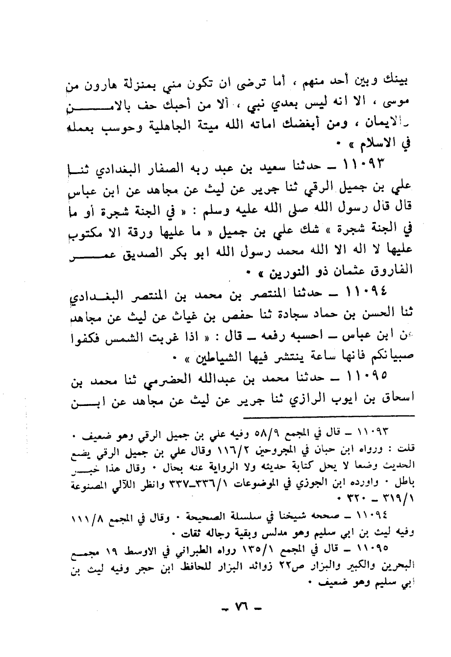 11093 - حَدَّثَنَا سَعِيدُ بْنُ عَبْدِ رَبِّهِ الصَّفَّارُ الْبَغْدَادِيُّ، ثنا عَلِيُّ بْنُ جَمِيلٍ الرَّقِّيُّ، ثنا جَرِيرٌ، عَنْ لَيْثٍ، عَنْ مُجَاهِدٍ، عَنِ ابْنِ عَبَّاسٍ، قَالَ: قَالَ رَسُولُ اللهِ صَلَّى اللهُ عَلَيْهِ وَسَلَّمَ: «§فِي الْجَنَّةِ شَجَرَةٌ أَوْ مَا فِي الْجَنَّةِ شَجَرَةٌ» - شَكَّ عَلِيُّ بْنُ جَمِيلٍ - «مَا عَلَيْهَا وَرَقَةٌ إِلَّا مَكْتُوبٌ عَلَيْهَا لَا إِلَهَ إِلَّا اللهُ مُحَمَّدٌ رَسُولُ اللهِ أَبُو بَكْرِ الصِّدِّيقُ عُمَرُ الْفاروقُ عُثْمَانُ ذُو النُّورَيْنِ»
