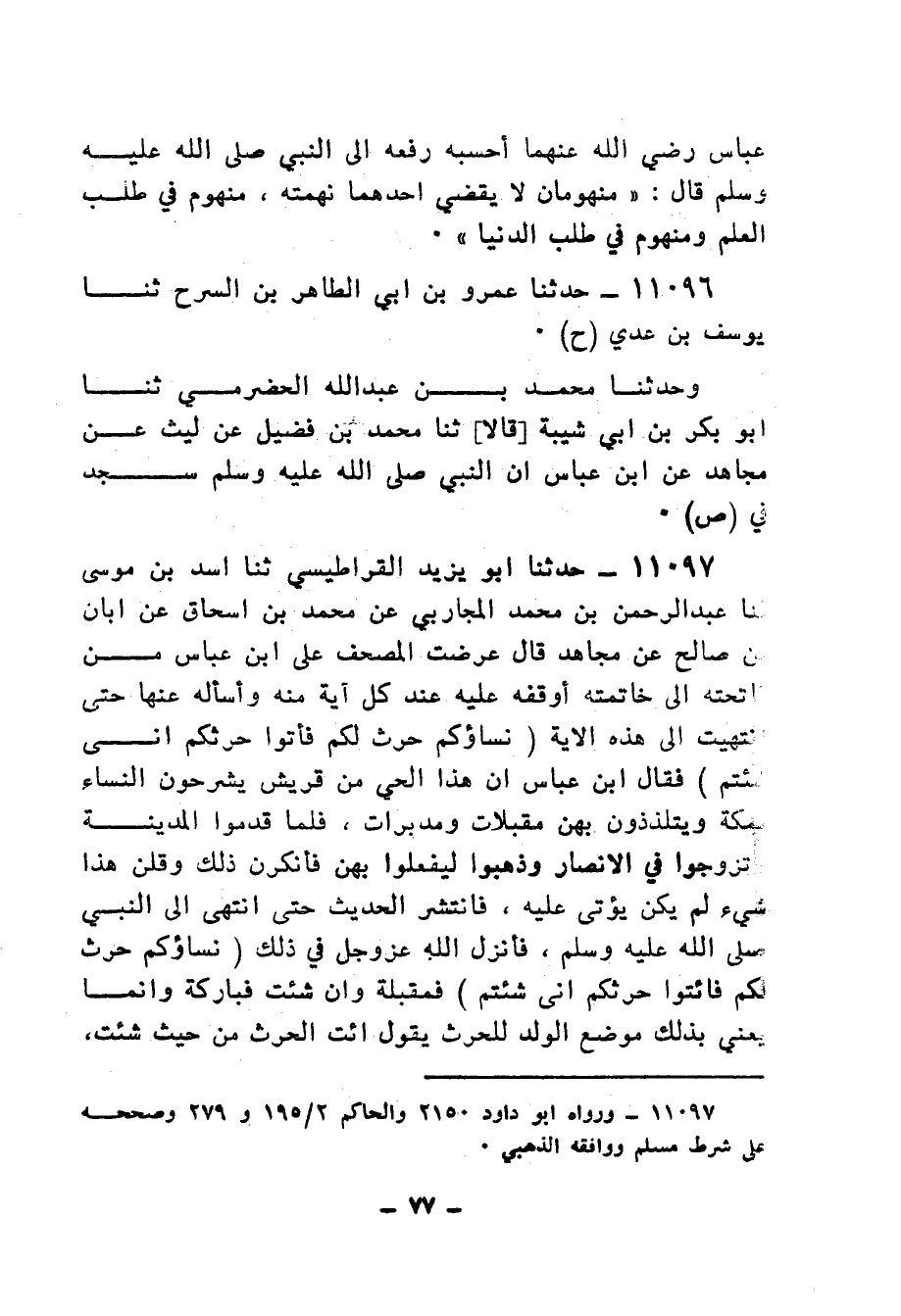11097 - حَدَّثَنَا أَبُو يَزِيدَ الْقراطيسيُّ، ثنا أَسَدُ بْنُ مُوسَى، ثنا عَبْدُ الرَّحْمَنِ بْنُ مُحَمَّدٍ الْمُحَارِبِيُّ، عَنْ مُحَمَّدِ بْنِ إِسْحَاقَ، عَنْ أَبَانَ بْنِ صَالِحٍ، عَنْ مُجَاهِدٍ، قَالَ: عَرَضْتُ الْمُصْحَفَ عَلَى ابْنِ عَبَّاسٍ مِنْ فاتحتِهِ إِلَى خَاتِمَتِهِ أُوقِفُهُ عَلَيْهِ عِنْدَ كُلِّ آيَةٍ مِنْهُ، وَأَسْأَلُهُ عَنْهَا حَتَّى انْتَهَيْتُ إِلَى هَذِهِ الْآيَةِ {نِسَاؤُكُمْ حَرْثٌ لَكُمْ فَأْتُوا حَرْثَكُمْ أَنَّى شِئْتُمْ} [البقرة: 223] فَقَالَ ابْنُ عَبَّاسٍ: " إِنَّ §هَذَا الْحَيَّ مِنْ قُرَيْشٍ يَشْرَحُونَ النِّسَاءَ بِمَكَّةَ وَيَتَلَذَّذُونَ بِهِنَّ مُقْبِلَاتٍ، وَمُدْبِرَاتٍ فَلَمَّا قَدِمُوا الْمَدِينَةَ وَتَزَوَّجُوا فِي الْأَنْصَارِ وَذَهَبُوا لِيَفْعَلُوا بِهِنَّ، فأَنْكَرْنَ ذَلِكَ وَقُلْنَ هَذَا شَيْءٌ لَمْ يَكُنْ يُؤْتَى عَلَيْهِ، فانْتَشَرَ الْحَدِيثُ حَتَّى انْتَهَى إِلَى النَّبِيِّ صَلَّى اللهُ عَلَيْهِ وَسَلَّمَ فَأَنْزَلَ اللهُ عَزَّ وَجَلَّ فِي ذَلِكَ: {نِسَاؤُكُمْ حَرْثٌ لَكُمْ فَأْتُوا حَرْثَكُمْ أَنَّى شِئْتُمْ} [البقرة: 223] فمُقْبِلَةً، وَإِنْ شِئْتَ فباركةً "، وَإِنَّمَا يَعْنِي بِذَلِكَ مَوْضِعَ الْوَلَدِ لِلْحَرْثِ يَقُولُ: ائْتِ الْحَرْثَ مِنْ حَيْثُ شِئْتَ، فَقَالَ ابْنُ عَبَّاسٍ: قَالَ ابْنُ عُمَرَ فِي دُبُرِهَا فَأَوْهَمَ ابْنُ عُمَرَ وَاللهُ يَغْفِرُ لَهُ وَإِنَّمَا كَانَ الْحَدِيثُ عَلَى هَذَا