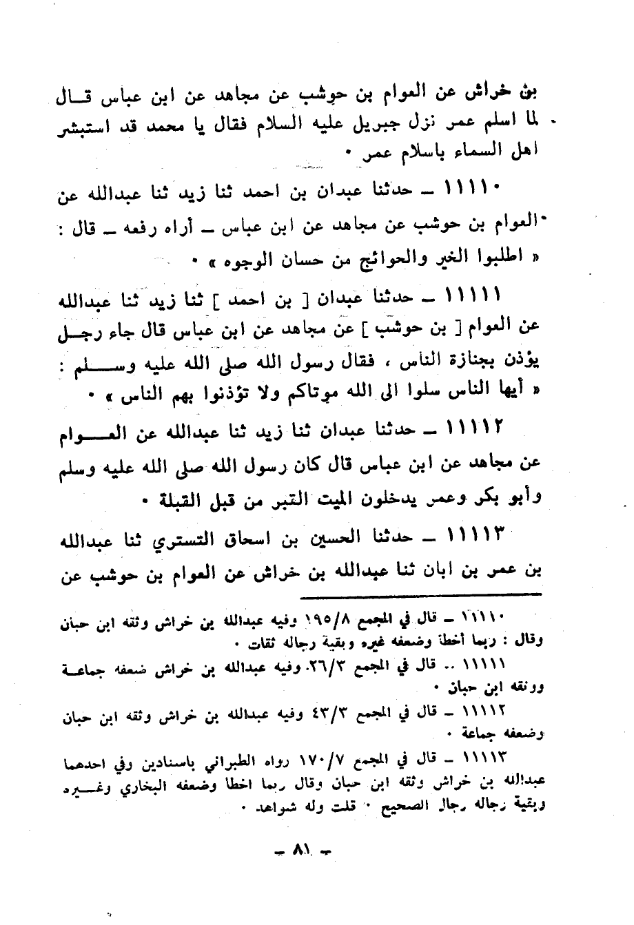 11111 - حَدَّثَنَا عَبْدَانُ بْنُ أَحْمَدَ، ثنا زَيْدٌ، ثنا عَبْدُ اللهِ، عَنِ الْعَوَّامِ بْنِ حَوْشَبٍ، عَنْ مُجَاهِدٍ، عَنِ ابْنِ عَبَّاسٍ، قَالَ: جَاءَ رَجُلٌ يُؤْذِنُ بِجِنَازَةِ النَّاسِ، فَقَالَ رَسُولُ اللهِ صَلَّى اللهُ عَلَيْهِ وَسَلَّمَ: «§أَيُّهَا النَّاسُ سَلُوا إِلَى اللهِ مَوْتَاكُمْ، وَلَا تُؤْذِنُوا بِهِمُ النَّاسَ»