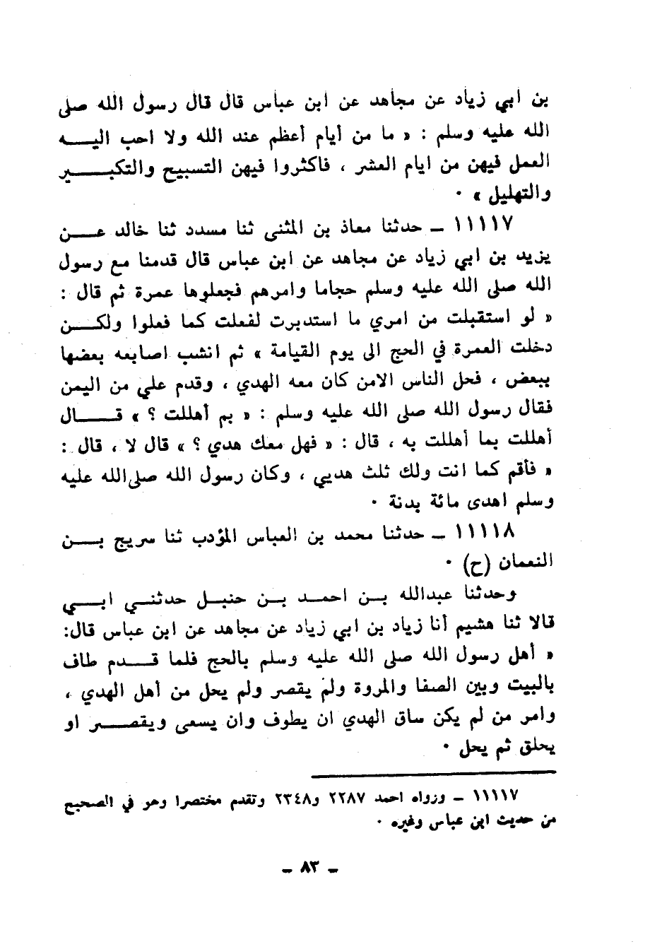 11118 - حَدَّثَنَا مُحَمَّدُ بْنُ الْعَبَّاسِ الْمُؤَدِّبُ، ثنا سُرَيْجُ بْنُ النُّعْمَانِ، ح، وَحَدَّثَنَا عَبْدُ اللهِ بْنُ أَحْمَدَ بْنِ حَنْبَلٍ، حَدَّثَنِي أَبِي، قَالَا: ثنا هُشَيْمٌ، أنا زِيَادُ بْنُ أَبِي زِيَادٍ، عَنْ مُجَاهِدٍ، عَنِ ابْنِ عَبَّاسٍ، قَالَ: «§أَهَلَّ رَسُولُ اللهِ صَلَّى اللهُ عَلَيْهِ وَسَلَّمَ بِالْحَجِّ، فَلَمَّا قَدِمَ طَافَ بِالْبَيْتِ وَبَيْنَ الصَّفَا وَالْمَرْوَةِ، وَلَمْ يُقَصِّرْ وَلَمْ يَحِلَّ مَنْ أَهَلَّ الْهَدْيَ، وَأَمَرَ مَنْ لَمْ يَكُنْ سَاقَ الْهَدْي أَنْ يَطُوفَ، وَأَنْ يَسْعَى وَيُقَصِّرَ أَوْ يَحْلِقَ، ثُمَّ يَحِلَّ»