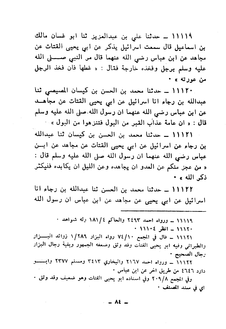 11120 - حَدَّثَنَا مُحَمَّدُ بْنُ الْحَسَنِ بْنِ كَيْسَانَ الْمِصِّيصِيُّ، ثنا عَبْدُ اللهِ بْنُ رَجَاءٍ، أنا إِسْرَائِيلُ، عَنْ أَبِي يَحْيَى الْقَتَّاتِ، عَنْ مُجَاهِدٍ، عَنِ ابْنِ عَبَّاسٍ رَضِي اللهُ عَنْهُمَا، أَنَّ رَسُولَ اللهِ صَلَّى اللهُ عَلَيْهِ وَسَلَّمَ قَالَ: «§إِنَّ عَامَّةَ عَذَابِ الْقَبْرِ مِنَ الْبَوْلِ فَتَنَزَّهُوا مِنَ الْبَوْلِ»