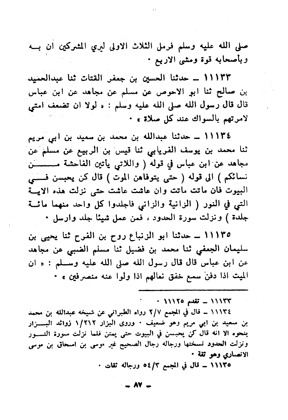 11133 - حَدَّثَنَا الْحُسَيْنُ بْنُ جَعْفَرٍ الْقَتَّاتُ، ثنا عَبْدُ الْحَمِيدِ بْنُ صَالِحٍ، ثنا أَبُو الْأَحْوَصِ، عَنْ مُسْلِمٍ، عَنْ مُجَاهِدٍ، عَنِ ابْنِ عَبَّاسٍ، قَالَ: قَالَ رَسُولُ اللهِ صَلَّى اللهُ عَلَيْهِ وَسَلَّمَ: «§لَوْلَا أَنْ تَضْعُفَ أُمَّتِي لَأَمَرْتُهُمْ بِالسِّوَاكِ عِنْدَ كُلِّ صَلَاةٍ»