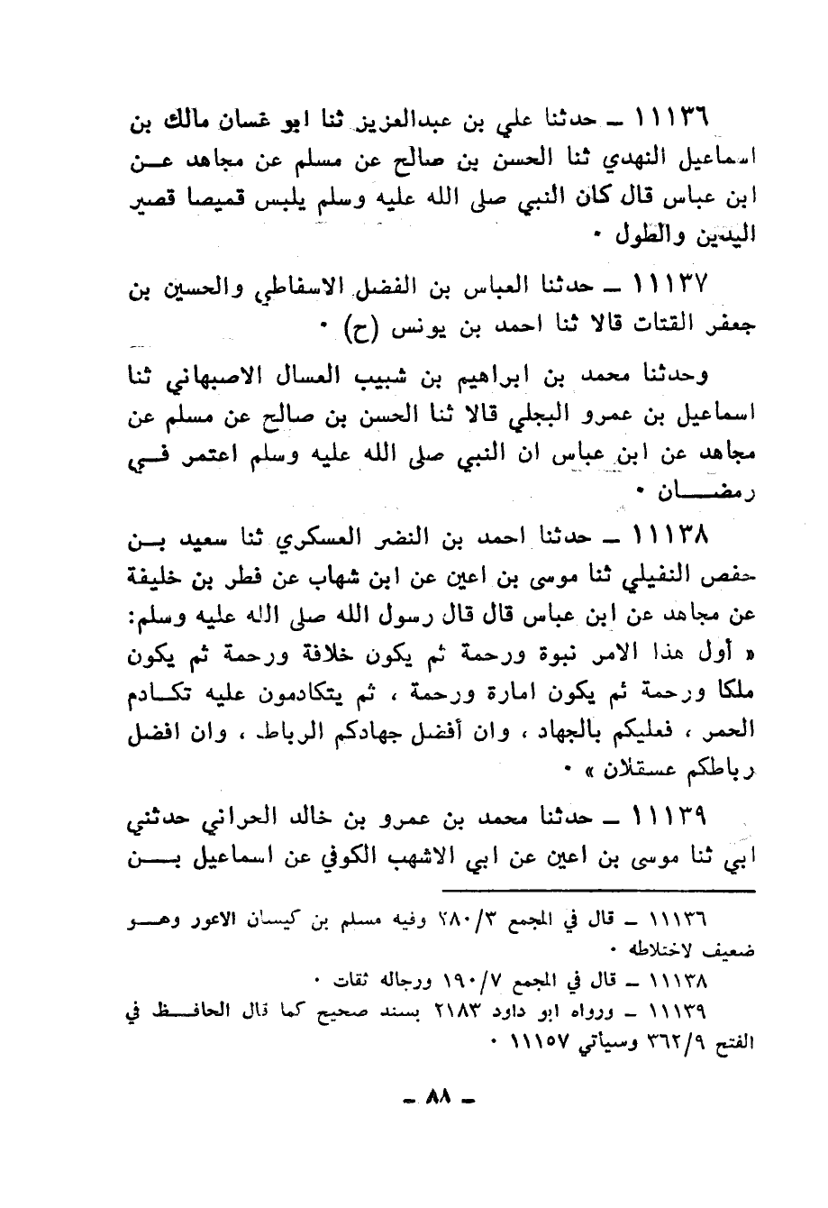 11138 - حَدَّثَنَا أَحْمَدُ بْنُ النَّضْرِ الْعَسْكَرِيُّ، ثنا سَعِيدُ بْنُ حَفْصٍ النُّفَيْلِيُّ، ثنا مُوسَى بْنُ أَعْيَنَ، عَنِ ابْنِ شِهَابٍ، عَنْ فِطْرِ بْنِ خَلِيفَةَ، عَنْ مُجَاهِدٍ، عَنِ ابْنِ عَبَّاسٍ، قَالَ: قَالَ رَسُولُ اللهِ صَلَّى اللهُ عَلَيْهِ وَسَلَّمَ: «§أَوَّلُ هَذَا الْأَمْرِ نُبُوَّةٌ وَرَحْمَةٌ، ثُمَّ يَكُونُ خِلَافَةً وَرَحْمَةً، ثُمَّ يَكُونُ مُلْكًا وَرَحْمَةً، ثُمَّ يَكُونُ إِمَارَةً وَرَحْمَةً، ثُمَّ يَتَكادَمُونَ عَلَيْهِ تَكادُمَ الْحُمُرِ فَعَلَيْكُمْ بِالْجِهَادِ، وَإِنَّ أَفْضَلَ جهادِكُمُ الرِّبَاطُ، وَإِنَّ أَفْضَلَ رباطِكُمْ عَسْقَلَانُ»