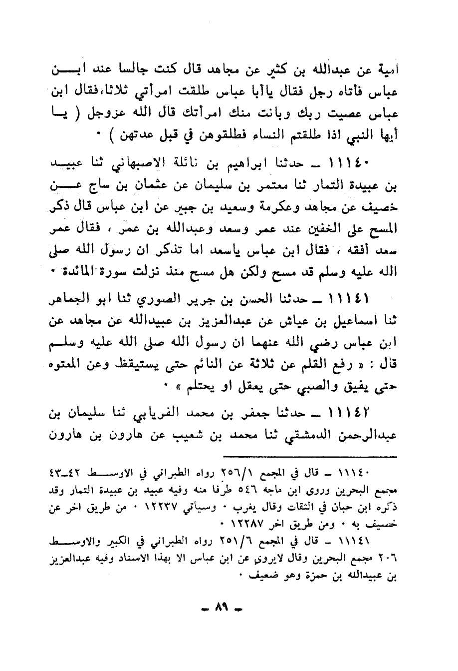 11141 - حَدَّثَنَا الْحَسَنُ بْنُ جَرِيرٍ الصُّورِيُّ، ثنا أَبُو الْجُمَاهِرِ، ثنا إِسْمَاعِيلُ بْنُ عَيَّاشٍ، عَنْ عَبْدِ الْعَزِيزِ بْنِ عُبَيْدِ اللهِ، عَنْ مُجَاهِدٍ، عَنِ ابْنِ عَبَّاسٍ رَضِي اللهُ عَنْهُمَا، أَنَّ رَسُولَ اللهِ صَلَّى اللهُ عَلَيْهِ وَسَلَّمَ قَالَ: " §رُفِعَ الْقَلَمُ عَنْ ثَلَاثَةٍ: عَنِ النَّائِمِ حَتَّى يَسْتَيْقِظَ، وَعَنِ الْمَعْتُوهِ حَتَّى يُفِيقَ، وَالصَّبِيِّ حَتَّى يَعْقِلَ أَوْ يَحْتَلِمَ "