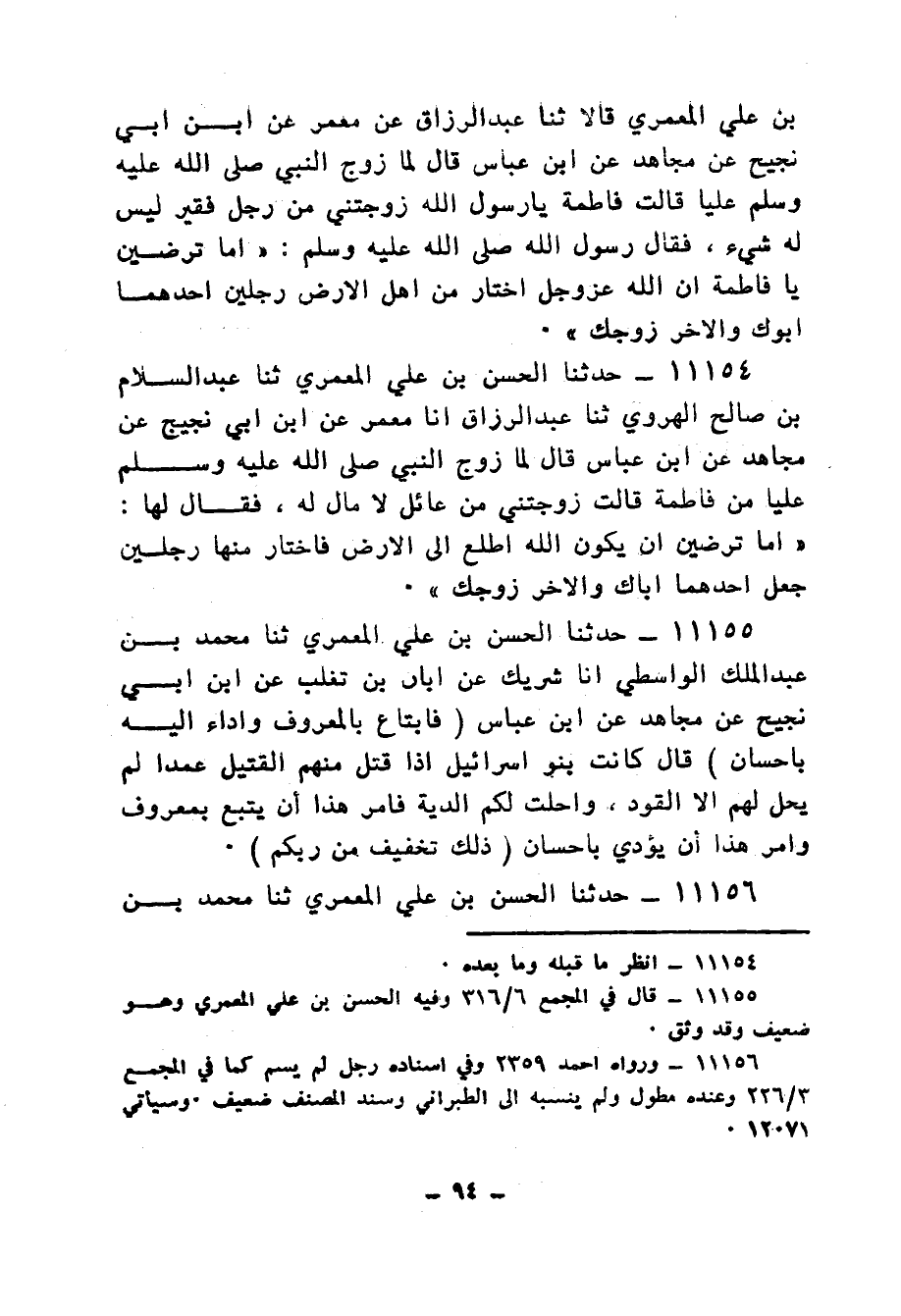11154 - حَدَّثَنَا الْحَسَنُ بْنُ عَلِيٍّ الْمَعْمَرِيُّ، ثنا عَبْدُ السَّلَامِ بْنُ صَالِحٍ الْهَرَوِيُّ، ثنا عَبْدُ الرَّزَّاقِ، أنا مَعْمَرٌ، عَنِ ابْنِ أَبِي نَجِيحٍ، عَنْ مُجَاهِدٍ، عَنِ ابْنِ عَبَّاسٍ، قَالَ: لَمَّا زَوَّجَ النَّبِيُّ صَلَّى اللهُ عَلَيْهِ وَسَلَّمَ عَلِيًّا مِنْ فَاطِمَةَ، قَالَتْ: زَوَّجْتَنِي مِنْ عائلٍ لَا مَالَ لَهُ، فَقَالَ لَهَا: «أَمَا تَرْضَيْنَ أَنْ يَكُونَ §اللهُ اطَّلَعَ إِلَى الْأَرْضِ فَاخْتَارَ مِنْهَا رَجُلَيْنِ جَعَلَ أَحَدَهُمَا أَبَاكِ وَالْآخَرَ زَوْجَكِ»