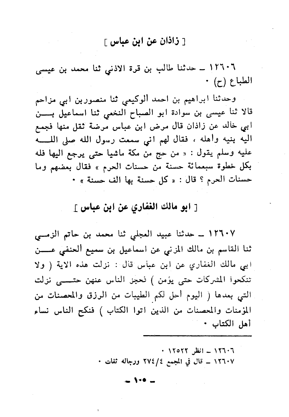 12606 - حَدَّثَنَا طَالِبُ بْنُ قُرَّةَ الْأَذَنِيُّ، ثنا مُحَمَّدُ بْنُ عِيسَى الطَّبَّاعُ، ح وَحَدَّثَنَا إِبْرَاهِيمُ بْنُ أَحْمَدَ الْوَكِيعِيُّ، ثنا مَنْصُورُ بْنُ أَبِي مُزَاحِمٍ، قَالَا: ثنا عِيسَى بْنُ سَوَادَةَ أَبُو الصَّبَّاحِ النَّخَعِيُّ، ثنا إِسْمَاعِيلُ بْنُ أَبِي خَالِدٍ، عَنْ زَاذَانَ قَالَ: مَرِضَ ابْنُ عَبَّاسٍ مَرْضَةً ثَقُلَ مِنْهَا، فَجَمَعَ إِلَيْهِ بَنِيهِ وَأَهْلَهُ، فَقَالَ لَهُمْ: إِنِّي سَمِعْتُ رَسُولَ اللهِ صَلَّى اللهُ عَلَيْهِ وَسَلَّمَ يَقُولُ: «§مَنْ حَجَّ مِنْ مَكَّةَ مَاشِيًا حَتَّى يَرْجِعَ إِلَيْهَا فَلَهُ بِكُلِّ خُطْوَةٍ سَبْعُمِائَةِ حَسَنَةٍ مِنْ حَسَنَاتِ الْحَرَمِ» , فَقَالَ بَعْضُهُمْ: وَمَا حَسَنَاتُ الْحَرَمِ؟ قَالَ: «كُلُّ حَسَنَةٍ بِهَا أَلْفُ حَسَنَةٍ»