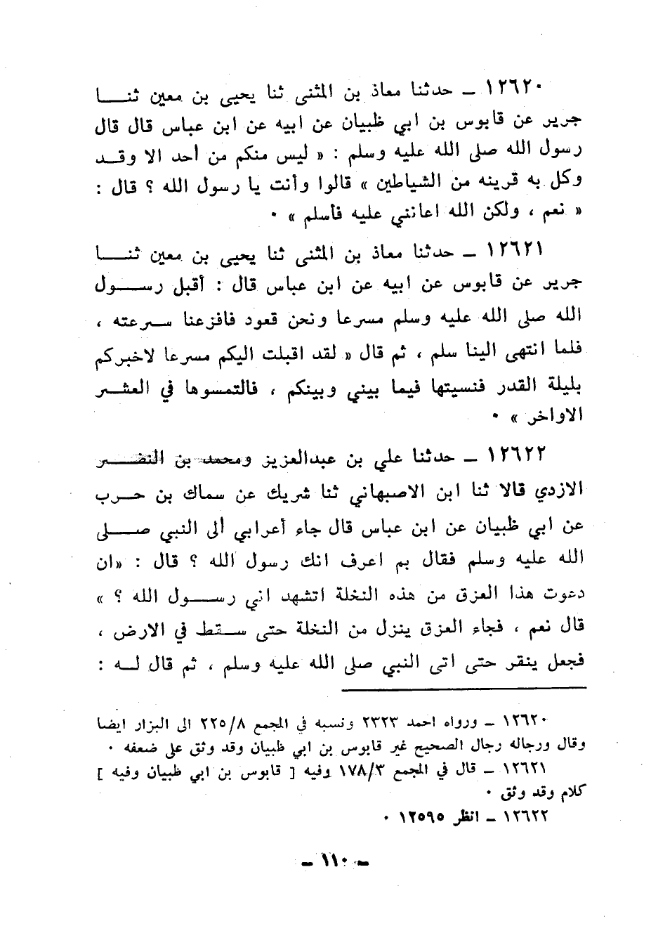 12620 - حَدَّثَنَا مُعَاذُ بْنُ الْمُثَنَّى، ثنا يَحْيَى بْنُ مَعِينٍ، ثنا جَرِيرٌ، عَنْ قَابُوسَ بْنِ أَبِي ظَبْيَانَ، عَنْ أَبِيهِ، عَنِ ابْنِ عَبَّاسٍ قَالَ: قَالَ رَسُولُ صَلَّى اللهُ عَلَيْهِ وَسَلَّمَ: «§لَيْسَ مِنْكُمْ مِنْ أَحَدٍ إِلَّا وَقَدْ وُكِّلَ بِهِ قَرِينُهُ مِنَ الشَّيَاطِينِ» . قَالُوا: وَأَنْتَ يَا رَسُولَ اللهِ؟ قَالَ: «نَعَمْ , وَلَكِنَّ اللهَ أَعَانَنِي عَلَيْهِ فَأَسْلَمَ»