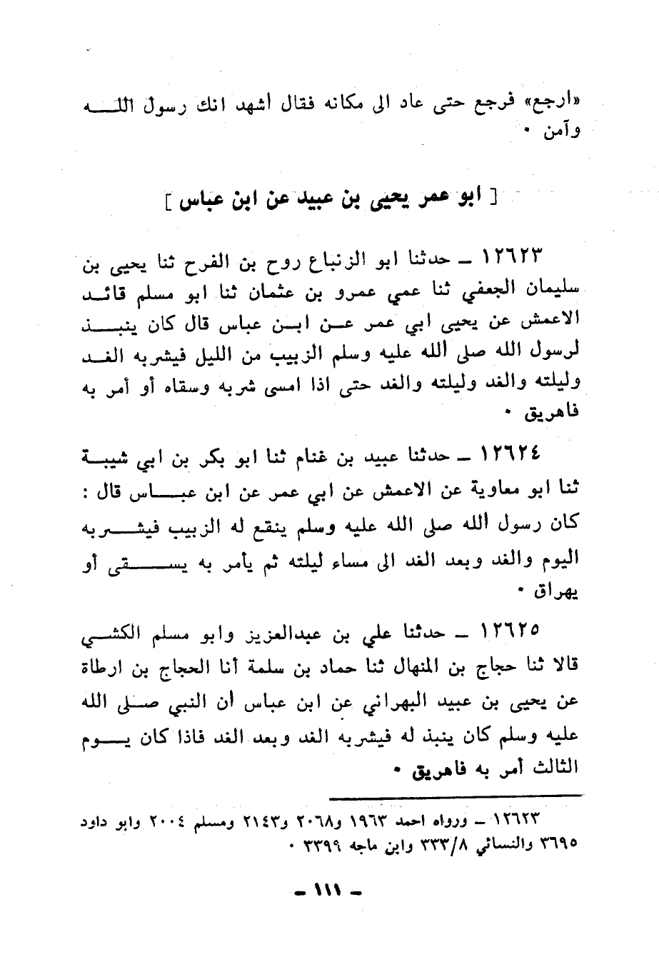 12623 - حَدَّثَنَا أَبُو الزِّنْبَاعِ رَوْحُ بْنُ الْفَرَجِ، ثنا يَحْيَى بْنُ سُلَيْمَانَ الْجُعْفِيُّ، ثنا عَمِّي، عَمْرُو بْنُ عُثْمَانَ، ثنا أَبُو مُسْلِمٍ قَائِدُ الْأَعْمَشِ، عَنْ أَبِي عُمَرَ، عَنِ ابْنِ عَبَّاسٍ قَالَ: «كَانَ §يُنْبَذُ لِرَسُولِ اللهِ صَلَّى اللهُ عَلَيْهِ وَسَلَّمَ الزَّبِيبُ مِنَ اللَّيْلِ فَيَشْرَبُهُ الْغَدَ وَلَيْلَتَهُ، وَالْغَدَ وَلَيْلَتَهُ، وَالْغَدَ حَتَّى إِذَا أَمْسَى شَرِبَهُ، وَسَقَاهُ أَوْ أَمَرَ بِهِ فَأُهْرِيقَ»