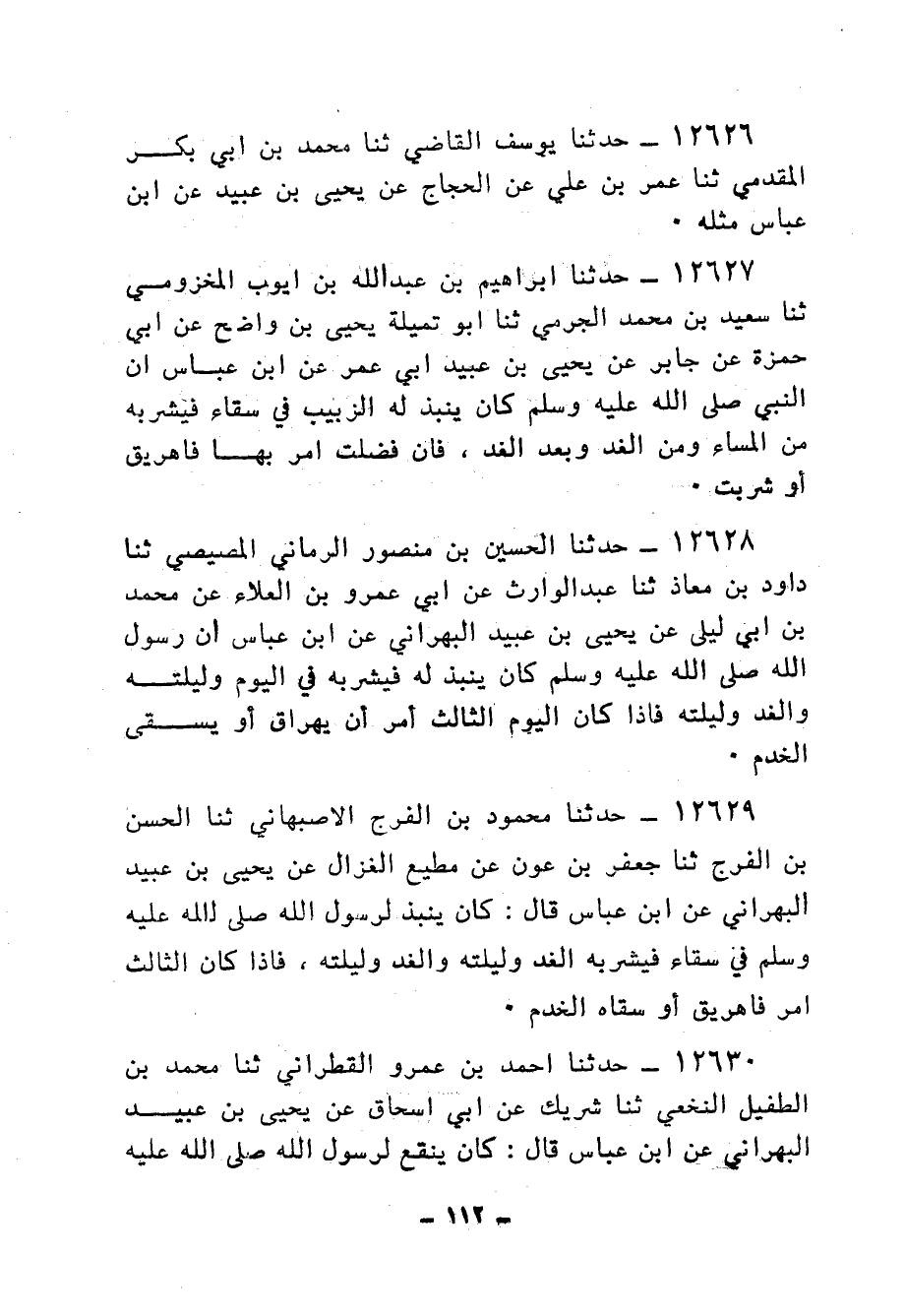 12630 - حَدَّثَنَا أَحْمَدُ بْنُ عَمْرٍو الْقَطِرَانِيُّ، ثنا مُحَمَّدُ بْنُ الطُّفَيْلِ النَّخَعِيُّ، ثنا شَرِيكٌ، عَنْ أَبِي إِسْحَاقَ، عَنْ يَحْيَى بْنِ عُبَيْدٍ الْبَهْرَانِيِّ، عَنِ ابْنِ عَبَّاسٍ قَالَ: «كَانُ §يُنْقَعُ لِرَسُولِ اللهِ صَلَّى اللهُ عَلَيْهِ وَسَلَّمَ فَيَشْرَبُهُ يَوْمَهُ، وَمِنَ الْغَدِ، وَالْيَوْمِ الثَّالِثِ، فَإِذَا كَانَ الْعَشِيُّ أَهْرَاقَهُ، أَوْ سَقَاهُ الْخَدَمَ، وَلَمْ يَسْقِ الْخَدَمَ حَرَامًا»