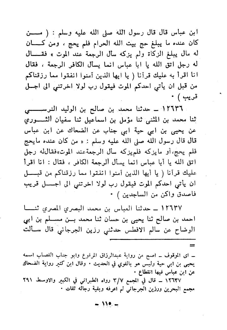 12636 - حَدَّثَنَا مُحَمَّدُ بْنُ صَالِحِ بْنِ الْوَلِيدِ النَّرْسِيُّ، ثنا مُحَمَّدُ بْنُ الْمُثَنَّى، ثنا مُؤَمَّلُ بْنُ إِسْمَاعِيلَ، ثنا سُفْيَانُ الثَّوْرِيُّ، عَنْ يَحْيَى بْنِ أَبِي حَيَّةَ أَبِي جَنَابٍ، عَنِ الضَّحَّاكِ، عَنِ ابْنِ عَبَّاسٍ قَالَ: قَالَ رَسُولُ اللهِ صَلَّى اللهُ عَلَيْهِ وَسَلَّمَ: «§مَنْ كَانَ عِنْدَهُ مَا يَحُجُّ فَلَمْ يَحُجَّ، أَوْ مَا يُزَكِّهِ فَلَمْ يُزَكِّهِ سَأَلَ الرَّجْعَةَ عِنْدَ الْمَوْتِ» , فَقَالَ لَهُ رَجُلٌ: اتَّقِ اللهَ يَا أَبَا عَبَّاسٍ إِنَّمَا يَسْأَلُ الرَّجْعَةَ الْكَافِرُ، فَقَالَ: «أَنَا أَقْرَأُ عَلَيْكَ قُرْآنًا {يَا أَيُّهَا الَّذِينَ آمَنُوا أَنْفِقُوا مِمَا رَزَقْنَاكُمْ مِنْ قَبْلِ أَنْ يَأْتِيَ أَحَدَكُمُ الْمَوْتُ فَيَقُولَ رَبِّ لَوْلَا أَخَّرْتَنِي إِلَى أَجَلٍ قَرِيبٍ فَأَصَّدَّقَ وَأَكُنْ مِنَ الصَّالِحِينَ} »