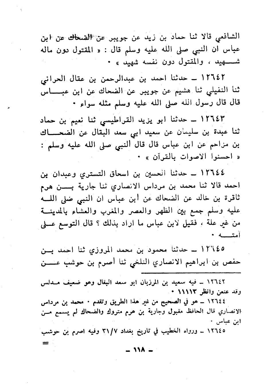 12643 - حَدَّثَنَا أَبُو يَزِيدَ الْقَرَاطِيسِيُّ، ثنا نُعَيْمُ بْنُ حَمَّادٍ، ثنا عَبْدَةُ بْنُ سُلَيْمَانَ، عَنْ سَعِيدٍ أَبِي سَعْدٍ الْبَقَّالِ، عَنِ الضَّحَّاكِ بْنِ مُزَاحِمٍ، عَنِ ابْنِ عَبَّاسٍ قَالَ: قَالَ النَّبِيُّ صَلَّى اللهُ عَلَيْهِ وَسَلَّمَ: «§أَحْسِنُوا الْأَصْوَاتَ بِالْقُرْآنِ»