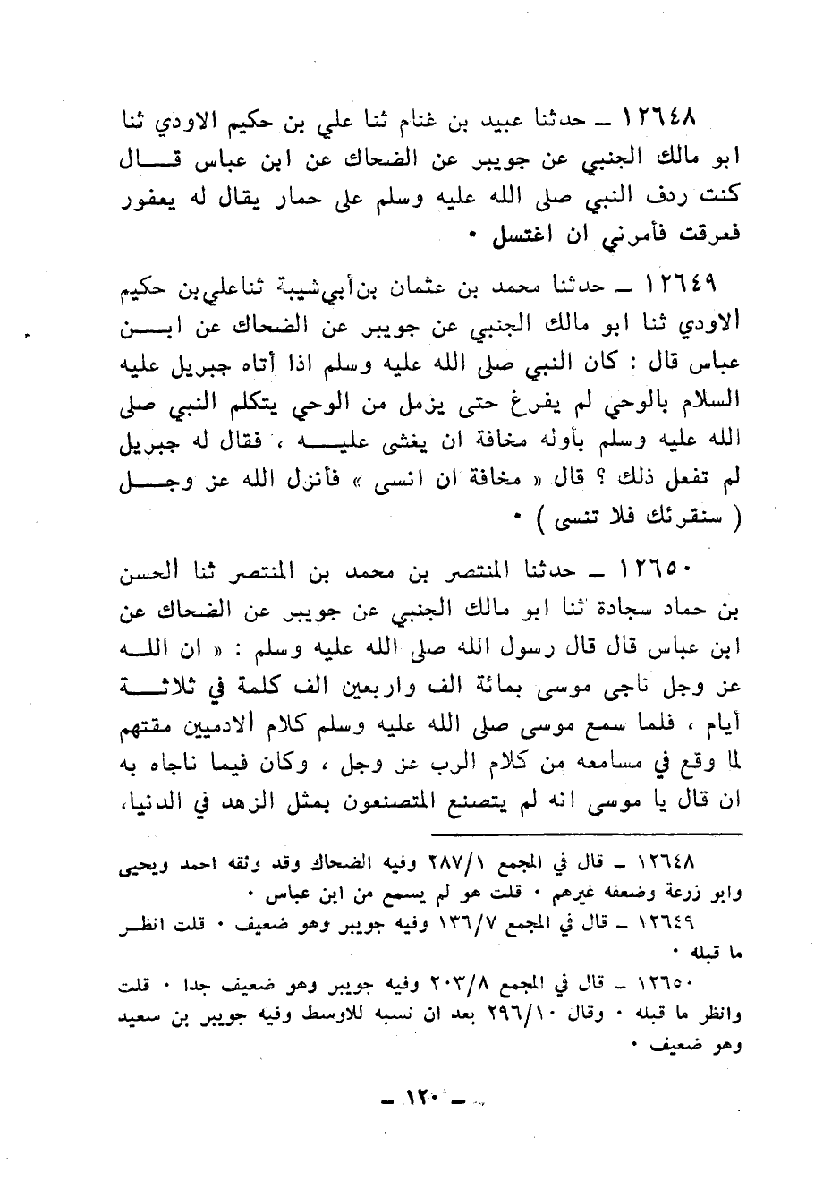 12650 - حَدَّثَنَا الْمُنْتَصِرُ بْنُ مُحَمَّدِ بْنِ الْمُنْتَصِرِ، ثنا الْحَسَنُ بْنُ حَمَّادٍ سَجَّادَةُ، ثنا أَبُو مَالِكٍ الْجَنْبِيُّ، عَنْ جُوَيْبِرٍ، عَنِ الضَّحَّاكِ، عَنِ ابْنِ عَبَّاسٍ قَالَ: قَالَ رَسُولُ اللهِ صَلَّى اللهُ عَلَيْهِ وَسَلَّمَ: " إِنَّ اللهَ عَزَّ وَجَلَّ: نَاجَى مُوسَى بِمِائَةِ أَلْفٍ، وَأَرْبَعِينَ أَلْفَ كَلِمَةٍ فِي ثَلَاثَةِ أَيَّامٍ، فَلَمَّا سَمِعَ مُوسَى صَلَّى اللهُ عَلَيْهِ وَسَلَّمَ كَلَامَ الْآدَمِيِّينَ مَقَتَهُمْ لِمَا وَقَعَ فِي مَسَامِعِهِ مِنْ كَلَامِ الرَّبِّ عَزَّ وَجَلَّ، وَكَانَ فِيمَا نَاجَاهُ بِهِ أَنْ قَالَ: §يَا مُوسَى إِنَّهُ لَمْ يَتَصَنَّعِ الْمُتَصَنِّعُونَ بِمِثْلِ الزُّهْدِ فِي الدُّنْيَا، وَلَمْ يَتَقَرَّبْ إِلَيَّ الْمُتَقَرِّبُونَ الْمُتَصَنِّعُونَ بِمِثْلِ الْوَرَعِ عَمَّا حُرِّمَتْ عَلَيْهِمْ، وَلَمْ يَتَعَبَّدِ الْمُتَعَبِّدُونَ بِمِثْلِ الْبُكَاءِ مِنْ خَشْيَتِي، قَالَ مُوسَى: يَا رَبَّ الْبَرِيَّةِ كُلِّهَا , وَيَا مَالِكَ يَوْمِ الدِّينِ، وَيَا ذَا الْجَلَالِ وَالْإِكْرَامِ , مَاذَا أَعْدَدْتَ لَهُمْ؟ وَمَاذَا جَزَيْتَهُمْ؟ قَالَ: أَمَّا الزُّهَّادُ فِي الدُّنْيَا فَإِنِّي أُبِيحُهُمْ جَنَّتِي يَتَبَوَّءُونَ مِنْهَا حَيْثُ شَاءُوا، وَأَمَّا الْوَرِعُونَ عَمَّا حَرَّمْتُ عَلَيْهِمْ، فَإِنَّهُ إِذَا كَانَ يَوْمُ الْقِيَامَةَ لَمْ يَبْقَ عَبْدٌ إِلَّا نَاقَشْتُهُ الْحِسَابَ وَنَقَشْتُهُ إِلَّا الْوَرِعِينَ، فَإِنِّي أَسْتَحْيِيهِمْ وَأُجِلُّهُمْ وَأُكْرِمُهُمْ، وَأُدْخِلُهُمُ الْجَنَّةَ بِغَيْرِ حِسَابٍ، وَأَمَّا الْبَكَّاءُونَ مِنْ خَشْيَتِي فَأُولَئِكَ لَهُمُ الرَّفِيعُ الْأَعْلَى لَا يُشَارَكُونَ فِيهِ "