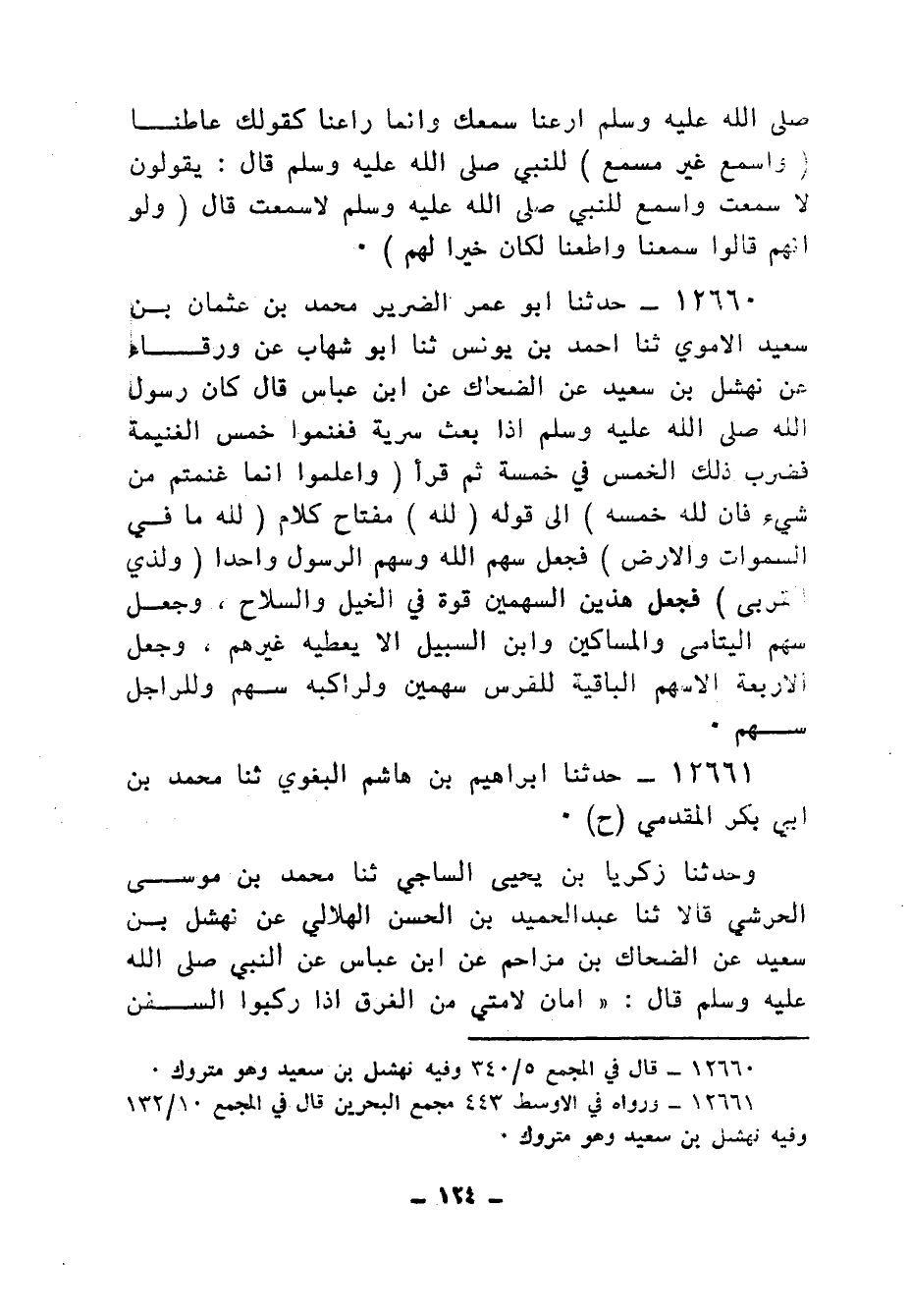 12660 - حَدَّثَنَا أَبُو عُمَرَ الضَّرِيرُ مُحَمَّدُ بْنُ عُثْمَانَ بْنِ سَعِيدٍ الْأُمَوِيُّ، ثنا أَحْمَدُ بْنُ يُونُسَ، ثنا أَبُو شِهَابٍ، عَنْ وَرْقَاءَ، عَنْ نَهْشَلِ بْنِ سَعِيدٍ، عَنِ الضَّحَّاكِ، عَنِ ابْنِ عَبَّاسٍ قَالَ: كَانَ رَسُولُ اللهِ صَلَّى اللهُ عَلَيْهِ وَسَلَّمَ " §إِذَا بَعَثَ سَرِيَّةً فَغَنِمُوا خَمَّسَ الْغَنِيمَةَ، فَضَرَبَ ذَلِكَ الْخُمُسَ فِي خَمْسَةٍ، ثُمَّ قَرَأَ: {وَاعْلَمُوا أَنَّمَا غَنِمْتُمْ مِنْ شَيْءٍ فَأَنَّ لِلَّهِ خُمُسَهُ} [الأنفال: 41] إِلَى قَوْلِهِ: {لِلَّهِ} [الأنفال: 41] مِفْتَاحِ كَلَامٍ {لِلَّهِ مَا فِي السَّمَاوَاتِ وَالْأَرْضِ} [البقرة: 284] فَجَعَلَ سَهْمَ اللهِ وَسَهْمَ الرَّسُولِ وَاحِدًا، {وَلِذِي الْقُرْبَى} [الأنفال: 41] فَجَعَلَ هَذَيْنِ السَّهْمَيْنِ قُوَّةً فِي الْخَيْلِ وَالسِّلَاحِ، وَجَعَلَ سَهْمَ الْيَتَامَى وَالْمَسَاكِينِ وَابْنِ السَّبِيلِ إِلَّا يُعْطِيهِ غَيْرَهَمْ، وَجَعَلَ الْأَرْبَعَةَ الْأَسْهُمَ الْبَاقِيَةَ لِلْفَرَسِ سَهْمَيْنِ، وَلِرَاكِبِهِ سَهْمٌ، وَلِلرَّاجِلِ سَهْمٌ "