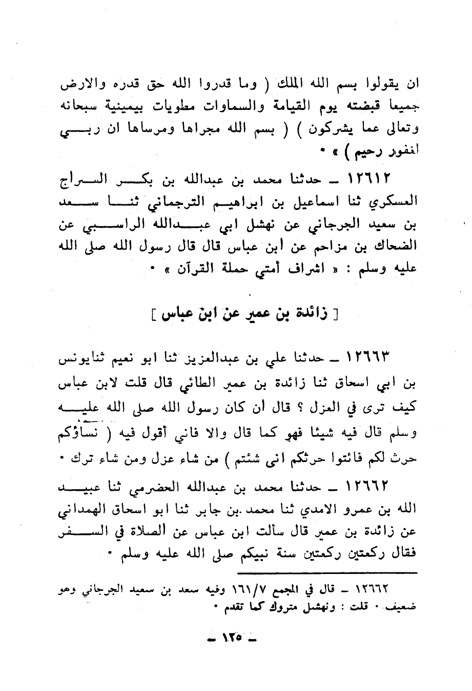 12664 - حَدَّثَنَا مُحَمَّدُ بْنُ عَبْدِ اللهِ الْحَضْرَمِيُّ، ثنا عُبَيْدُ اللهِ بْنُ عَمْرٍو الْآمِدِيُّ، ثنا مُحَمَّدُ بْنُ جَابِرٍ، ثنا أَبُو إِسْحَاقَ الْهَمْدَانِيُّ، عَنْ زَائِدَةَ بْنِ عُمَيْرٍ قَالَ: سَأَلْتُ ابْنَ عَبَّاسٍ، عَنِ §الصَّلَاةِ فِي السَّفَرِ، فَقَالَ: «رَكْعَتَيْنِ رَكْعَتَيْنِ سُنَّةُ نَبِيِّكُمْ صَلَّى اللهُ عَلَيْهِ وَسَلَّمَ»