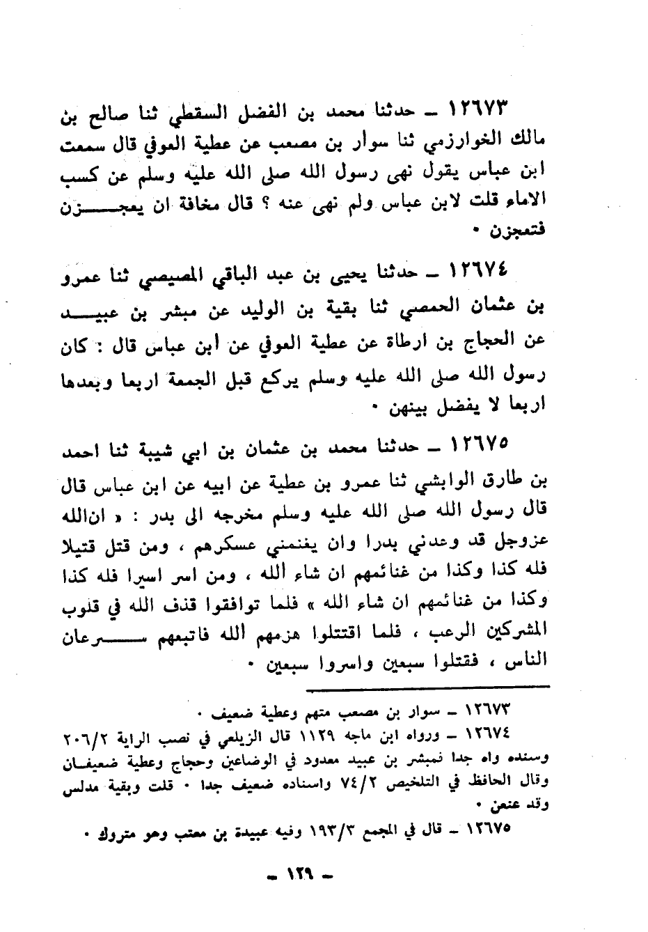 12674 - حَدَّثَنَا يَحْيَى بْنُ عَبْدِ الْبَاقِي الْمِصِّيصِيُّ، ثنا عَمْرُو بْنُ عُثْمَانَ الْحِمْصِيُّ، ثنا بَقِيَّةُ بْنُ الْوَلِيدِ، عَنْ مُبَشِّرِ بْنِ عُبَيْدٍ، عَنِ الْحَجَّاجِ بْنِ أَرْطَاةَ، عَنْ عَطِيَّةَ الْعَوْفِيِّ، عَنِ ابْنِ عَبَّاسٍ قَالَ: «كَانَ رَسُولُ اللهِ صَلَّى اللهُ عَلَيْهِ وَسَلَّمَ، §يَرْكَعُ قَبْلَ الْجُمُعَةِ أَرْبَعًا، وَبَعْدَهَا أَرْبَعًا لَا يَفْصِلُ بَيْنَهُنَّ»
