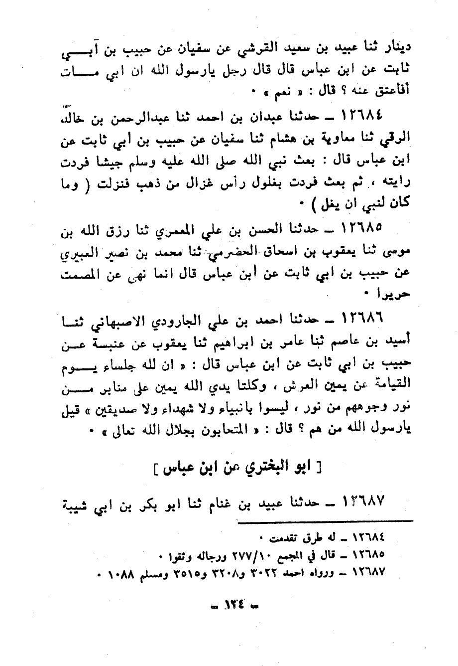 12686 - حَدَّثَنَا أَحْمَدُ بْنُ عَلِيٍّ الْجَارُودِيُّ الْأَصْبَهَانِيُّ، ثنا أَسِيدُ بْنُ عَاصِمٍ، ثنا عَامِرُ بْنُ إِبْرَاهِيمَ، ثنا يَعْقُوبُ، عَنْ عَنْبَسَةَ، عَنْ حَبِيبِ بْنِ أَبِي ثَابِتٍ، عَنِ ابْنِ عَبَّاسٍ قَالَ: «إِنَّ لِلَّهِ جُلَسَاءَ يَوْمَ الْقِيَامَةِ، عَنْ يَمِينِ الْعَرْشِ، وَكِلْتَا يَدَيِ اللهِ يَمِينٌ عَلَى مَنَابِرَ مِنْ نُورٍ، وُجُوهُهُمْ مِنْ نُورٍ لَيْسُوا بِأَنْبِيَاءَ، وَلَا شُهَدَاءَ، وَلَا صِدِّيقِينَ» قِيلَ: يَا رَسُولَ اللهِ , مَنْ هُمْ؟ قَالَ: «§الْمُتَحَابُّونَ بِجِلَالِ اللهِ تَعَالَى»