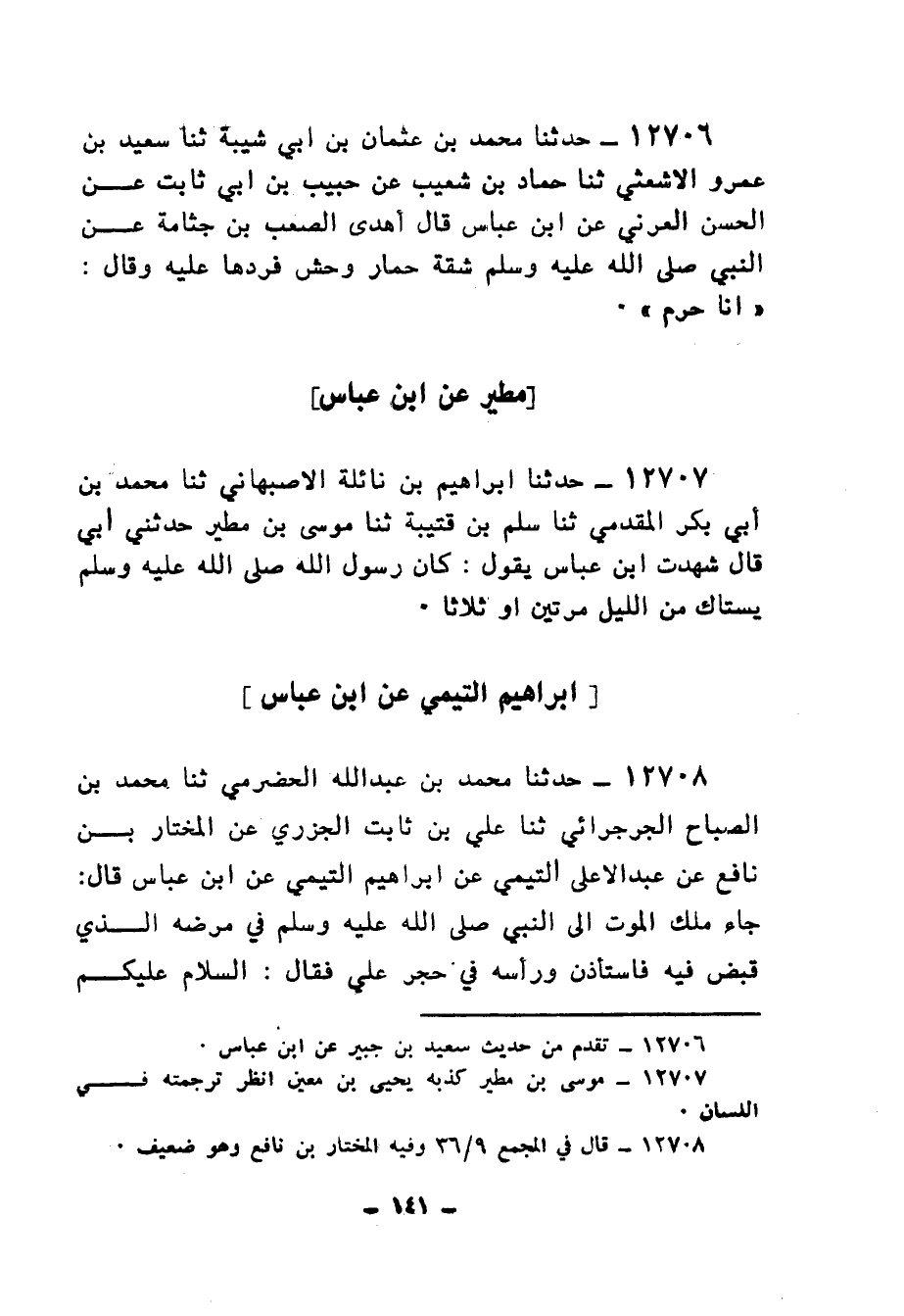 12707 - حَدَّثَنَا إِبْرَاهِيمُ بْنُ نَائِلَةَ الْأَصْبَهَانِيُّ، ثنا مُحَمَّدُ بْنُ أَبِي بَكْرٍ الْمُقَدَّمِيُّ، ثنا سَلْمُ بْنُ قُتَيْبَةَ، ثنا مُوسَى بْنُ مَطِيرٍ، حَدَّثَنِي أَبِي قَالَ: شَهِدْتُ ابْنَ عَبَّاسٍ يَقُولُ: كَانَ رَسُولُ اللهِ صَلَّى اللهُ عَلَيْهِ وَسَلَّمَ، «§يَسْتَاكُ مِنَ اللَّيْلِ مَرَّتَيْنِ أَوْ ثَلَاثًا»