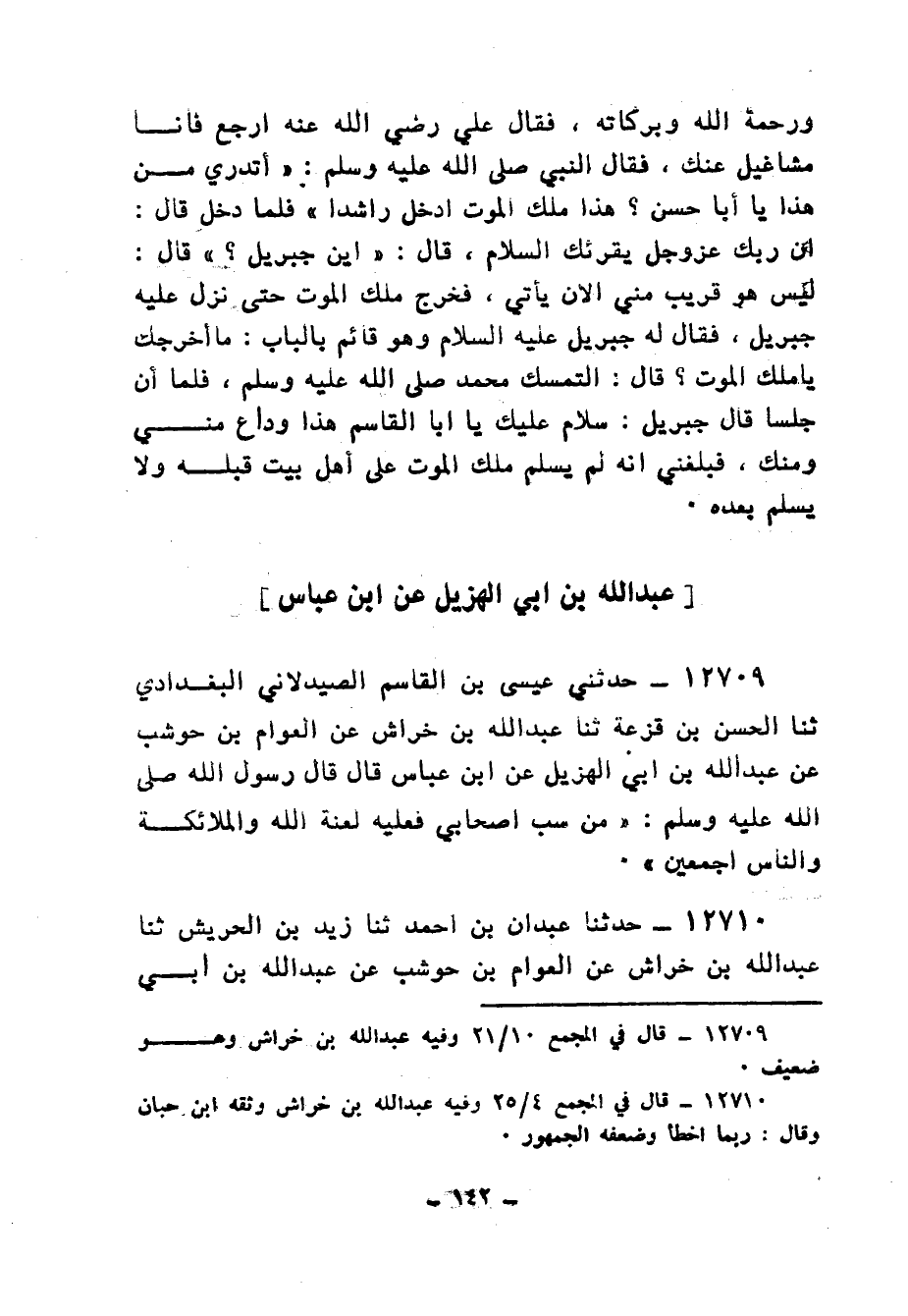 12709 - حَدَّثَنِي عِيسَى بْنُ الْقَاسِمِ الصَّيْدَلَانِيُّ الْبَغْدَادِيُّ، ثنا الْحَسَنُ بْنُ قَزَعَةَ، ثنا عَبْدُ اللهِ بْنُ خِرَاشٍ، عَنِ الْعَوَّامِّ بْنِ حَوْشَبٍ، عَنْ عَبْدِ اللهِ بْنِ أَبِي الْهُذَيْلِ، عَنِ ابْنِ عَبَّاسٍ قَالَ: قَالَ رَسُولُ اللهِ صَلَّى اللهُ عَلَيْهِ وَسَلَّمَ: «§مَنْ سَبَّ أَصْحَابِي فَعَلَيْهِ لَعْنَةُ اللهِ وَالْمَلَائِكَةِ، وَالنَّاسِ أَجْمَعِينَ»