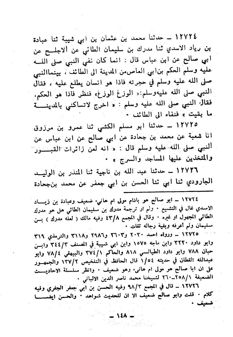 12725 - حَدَّثَنَا أَبُو مُسْلِمٍ الْكَشِّيُّ، ثنا عَمْرُو بْنُ مَرْزُوقٍ، أنا شُعْبَةُ، عَنْ مُحَمَّدِ بْنِ جُحَادَةَ، عَنْ أَبِي صَالِحٍ، عَنِ ابْنِ عَبَّاسٍ، عَنِ النَّبِيِّ صَلَّى اللهُ عَلَيْهِ وَسَلَّمَ قَالَ: «إِنَّهُ §لَعَنَ زَائِرَاتِ الْقُبُورِ، وَالْمُتَّخِذِينَ عَلَيْهَا الْمَسَاجِدَ، وَالسُّرُجَ»