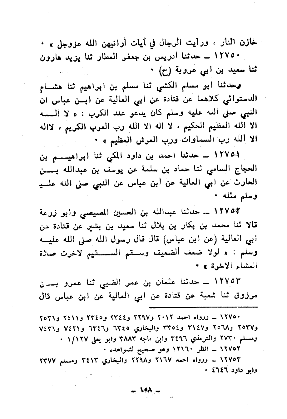 12750 - حَدَّثَنَا إِدْرِيسُ بْنُ جَعْفَرٍ الْعَطَّارُ، ثنا يَزِيدُ بْنُ هَارُونَ، ثنا سَعِيدُ بْنُ أَبِي عَرُوبَةَ، ح وَحَدَّثَنَا أَبُو مُسْلِمٍ الْكَشِّيُّ، ثنا مُسْلِمُ بْنُ إِبْرَاهِيمَ، ثنا هِشَامٌ الدَّسْتُوَائِيُّ كِلَاهُمَا، عَنْ قَتَادَةَ، عَنْ أَبِي الْعَالِيَةِ، عَنِ ابْنِ عَبَّاسٍ أَنَّ النَّبِيَّ صَلَّى اللهُ عَلَيْهِ وَسَلَّمَ كَانَ §يَدْعُو عِنْدَ الْكَرْبِ: «لَا إِلَهَ إِلَّا اللهُ الْعَظِيمُ الْحَلِيمُ , لَا إِلَهَ إِلَّا اللهُ رَبُّ الْعَرْشِ الْكَرِيمِ , لَا إِلَهُ إِلَّا اللهُ رَبُّ السَّمَاوَاتِ، وَرَبُّ الْعَرْشِ الْعَظِيمِ»