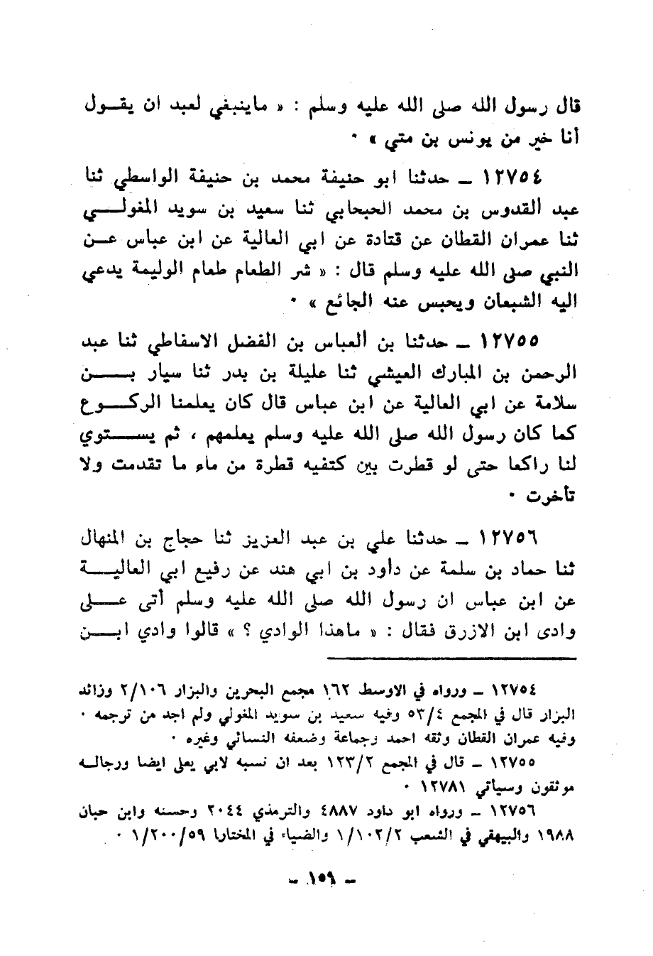12756 - حَدَّثَنَا عَلِيُّ بْنُ عَبْدِ الْعَزِيزِ، ثنا حَجَّاجُ بْنُ الْمِنْهَالِ، ثنا حَمَّادُ بْنُ سَلَمَةَ، عَنْ دَاوُدَ بْنِ أَبِي هِنْدَ، عَنْ رُفَيْعٍ أَبِي الْعَالِيَةِ، عَنِ ابْنِ عَبَّاسٍ أَنَّ رَسُولَ اللهِ صَلَّى اللهُ عَلَيْهِ وَسَلَّمَ: أَتَى عَلَى وَادِي ابْنِ الْأَزْرَقِ , فَقَالَ: «مَا هَذَا الْوَادِي؟» قَالُوا: وَادِي ابْنِ الْأَزْرَقِ قَالَ: «§كَأَنِّي أَنْظُرُ إِلَى مُوسَى صَلَّى اللهُ عَلَيْهِ وَسَلَّمَ مُنْهَبِطًا، وَلَهُ حُوَارٌ إِلَى رَبِّهِ بِالتَّلْبِيَةِ» ثُمَّ أَتَى عَلَى ثَنِيَّةٍ , فَقَالَ: «مَا هَذِهِ الثَّنِيَّةُ؟» قِيلَ: ثَنِيَّةُ كَذَا وَكَذَا قَالَ: «كَأَنِّي أَنْظُرُ إِلَى يُونُسَ بْنِ مَتَّى عَلَى نَاقَةٍ حَمْرَاءَ جَعْدَةٍ خِطَامُهَا لِيفٌ عَلَيْهِ جُبَّةٌ مِنْ صُوفٍ، وَهُوَ يُلَبِّي» قَالَ أَبُو الْقَاسِمِ: " قَالَ حَمَّادُ بْنُ سَلَمَةَ بْنِ الْأَزْرَقِ: وَإِنَّمَا هُوَ الْأَزْرَقُ "