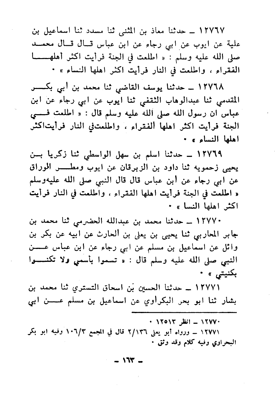 12767 - حَدَّثَنَا مُعَاذُ بْنُ الْمُثَنَّى، ثنا مُسَدَّدٌ، ثنا إِسْمَاعِيلُ ابْنُ عُلَيَّةَ، عَنْ أَيُّوبَ، عَنْ أَبِي رَجَاءٍ، عَنِ ابْنِ عَبَّاسٍ قَالَ: قَالَ مُحَمَّدٌ صَلَّى اللهُ عَلَيْهِ وَسَلَّمَ: «§اطَّلَعْتُ فِي الْجَنَّةِ فَرَأَيْتُ أَكْثَرَ أَهْلِهَا الْفُقَرَاءَ، وَاطَّلَعْتُ فِي النَّارِ فَرَأَيْتُ أَكْثَرَ أَهْلِهَا النِّسَاءَ»
