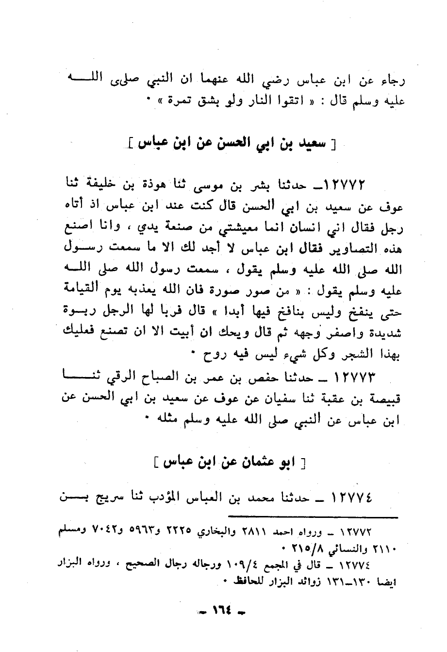 12772 - حَدَّثَنَا بِشْرُ بْنُ مُوسَى، ثنا هَوْذَةُ بْنُ خَلِيفَةَ، ثنا عَوْفٌ، عَنْ سَعِيدِ بْنِ أَبِي الْحَسَنِ قَالَ: كُنْتُ عِنْدَ ابْنِ عَبَّاسٍ إِذْ أَتَاهُ رَجُلٌ , فَقَالَ: إِنِّي إِنْسَانٌ إِنَّمَا مَعِيشَتِي مِنْ صَنْعَةِ يَدَيَّ، وَأَنَا أَصْنَعُ هَذِهِ التَّصَاوِيرَ , فَقَالَ ابْنُ عَبَّاسَ: لَا أَجِدُ لَكَ إِلَّا مَا سَمِعْتُ رَسُولَ اللهِ صَلَّى اللهُ عَلَيْهِ وَسَلَّمَ يَقُولُ: سَمِعْتُ رَسُولَ اللهِ صَلَّى اللهُ عَلَيْهِ وَسَلَّمَ يَقُولُ: «§مَنْ صَوَّرَ صُورَةً فَإِنَّ اللهَ يُعَذِّبُهُ يَوْمَ الْقِيَامَةِ حَتَّى يَنْفُخَ فِيهَا، وَلَيْسَ بِنَافِخٍ فِيهَا أَبَدًا» قَالَ: فَرَبَا لَهَا الرَّجُلُ رَبْوَةً شَدِيدَةً، وَاصْفَرَّ وَجْهُهُ، ثُمَّ قَالَ: «وَيْحَكَ إِنْ أَبَيْتَ إِلَّا أَنْ تَصْنَعَ فَعَلَيْكَ بِهَذَا الشَّجَرِ وَكُلِّ شَيْءٍ لَيْسَ فِيهِ رَوْحٌ» ،