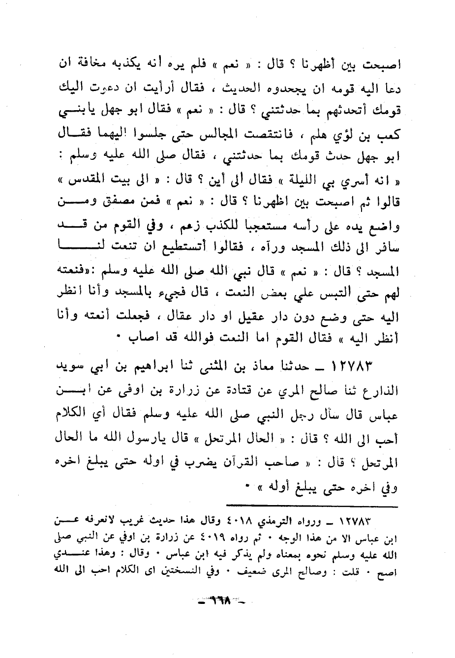 12783 - حَدَّثَنَا مُعَاذُ بْنُ الْمُثَنَّى، ثنا إِبْرَاهِيمُ بْنُ أَبِي سُوَيْدٍ الذَّارِعُ، ثنا صَالِحٌ الْمُرِّيُّ، عَنْ قَتَادَةَ، عَنْ زُرَارَةَ بْنِ أَوْفَى، عَنِ ابْنِ عَبَّاسٍ قَالَ: سَأَلَ رَجُلٌ النَّبِيَّ صَلَّى اللهُ عَلَيْهِ وَسَلَّمَ , فَقَالَ: أَيُّ الْكَلَامِ أَحَبُّ إِلَى اللهِ؟ قَالَ: «الْحَالُّ الْمُرْتَحِلُ» قَالَ: يَا رَسُولَ اللهِ , مَا الْحَالُّ الْمُرْتَحِلُ؟ قَالَ: «§صَاحِبُ الْقُرْآنِ يَضْرِبُ فِي أَوَّلِهِ حَتَّى يَبْلُغَ آخِرَهُ، وَفِي آخِرِهِ حَتَّى يَبْلُغَ أَوَّلَهُ»
