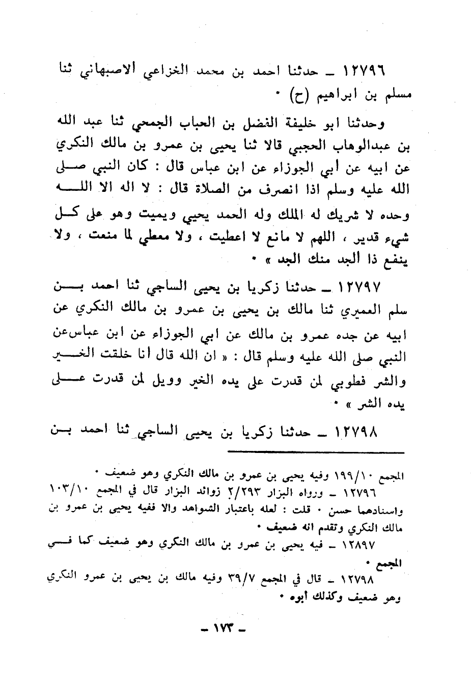 12796 - حَدَّثَنَا أَحْمَدُ بْنُ مُحَمَّدٍ الْخُزَاعِيُّ الْأَصْبَهَانِيُّ، ثنا مُسْلِمُ بْنُ إِبْرَاهِيمَ، ح وَحَدَّثَنَا أَبُو خَلِيفَةَ الْفَضْلُ بْنُ الْحُبَابِ الْجُمَحِيُّ، ثنا عَبْدُ اللهِ بْنُ عَبْدِ الْوَهَّابِ الْحَجَبِيُّ، قَالَا: ثنا يَحْيَى بْنُ عَمْرِو بْنِ مَالِكٍ النُّكْرِيُّ، عَنْ أَبِيهِ، عَنْ أَبِي الْجَوْزَاءِ، عَنِ ابْنِ عَبَّاسٍ، قَالَ: كَانَ النَّبِيُّ صَلَّى اللهُ عَلَيْهِ وَسَلَّمَ، §إِذَا انْصَرَفَ مِنَ الصَّلَاةِ قَالَ: «لَا إِلَهَ إِلَّا اللهُ وَحْدَهُ لَا شَرِيكَ لَهُ لَهُ الْمُلْكُ، وَلَهُ الْحَمْدُ يُحْيِي وَيُمِيتُ، وَهُوَ عَلَى كُلِّ شَيْءٍ قَدِيرٍ، اللهُمَّ لَا مَانِعَ لِمَا أَعْطَيْتَ، وَلَا مُعْطِيَ لِمَا مَنَعْتَ، وَلَا يَنْفَعُ ذَا الْجَدِّ مِنْكَ الْجَدُّ»