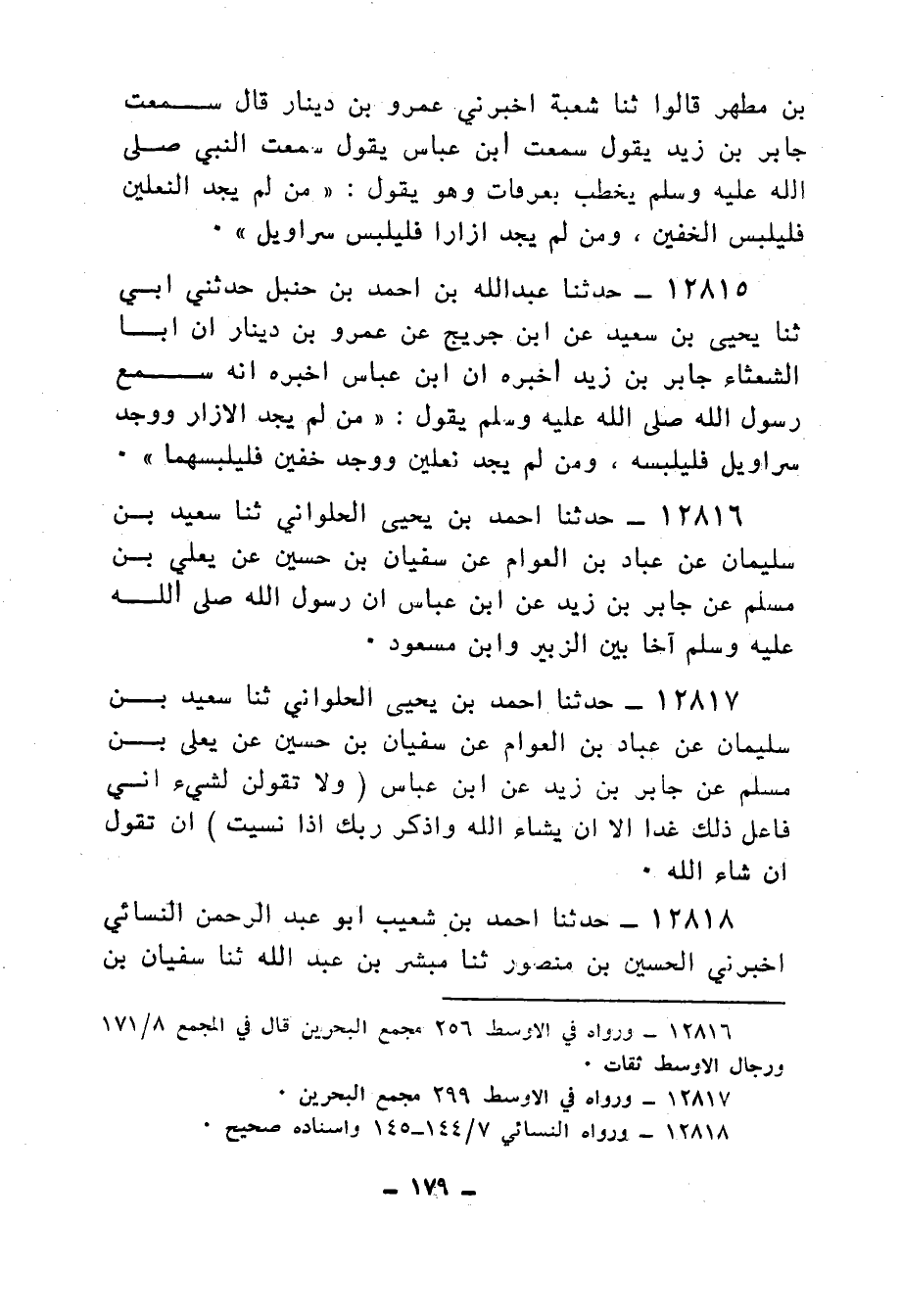 12815 - حَدَّثَنَا عَبْدُ اللهِ بْنُ أَحْمَدَ بْنِ حَنْبَلٍ، حَدَّثَنِي أَبِي، ثنا يَحْيَى بْنُ سَعِيدٍ، عَنِ ابْنِ جُرَيْجٍ، عَنْ عَمْرِو بْنِ دِينَارٍ أَنَّ أَبَا الشَّعْثَاءِ جَابِرَ بْنَ زَيْدٍ أَخْبَرَهُ أَنَّ ابْنَ عَبَّاسٍ أَخْبَرَهُ أَنَّهُ سَمِعَ رَسُولَ اللهِ صَلَّى اللهُ عَلَيْهِ وَسَلَّمَ يَقُولُ: «§مَنْ لَمْ يَجِدِ الْإِزَارَ، وَوَجَدَ سَرَاوِيلَ فَلْيَلْبَسْهُ، وَمَنْ لَمْ يَجِدْ نَعْلَيْنِ، وَوَجَدَ خُفَّيْنِ فَلْيَلْبَسْهُمَا»