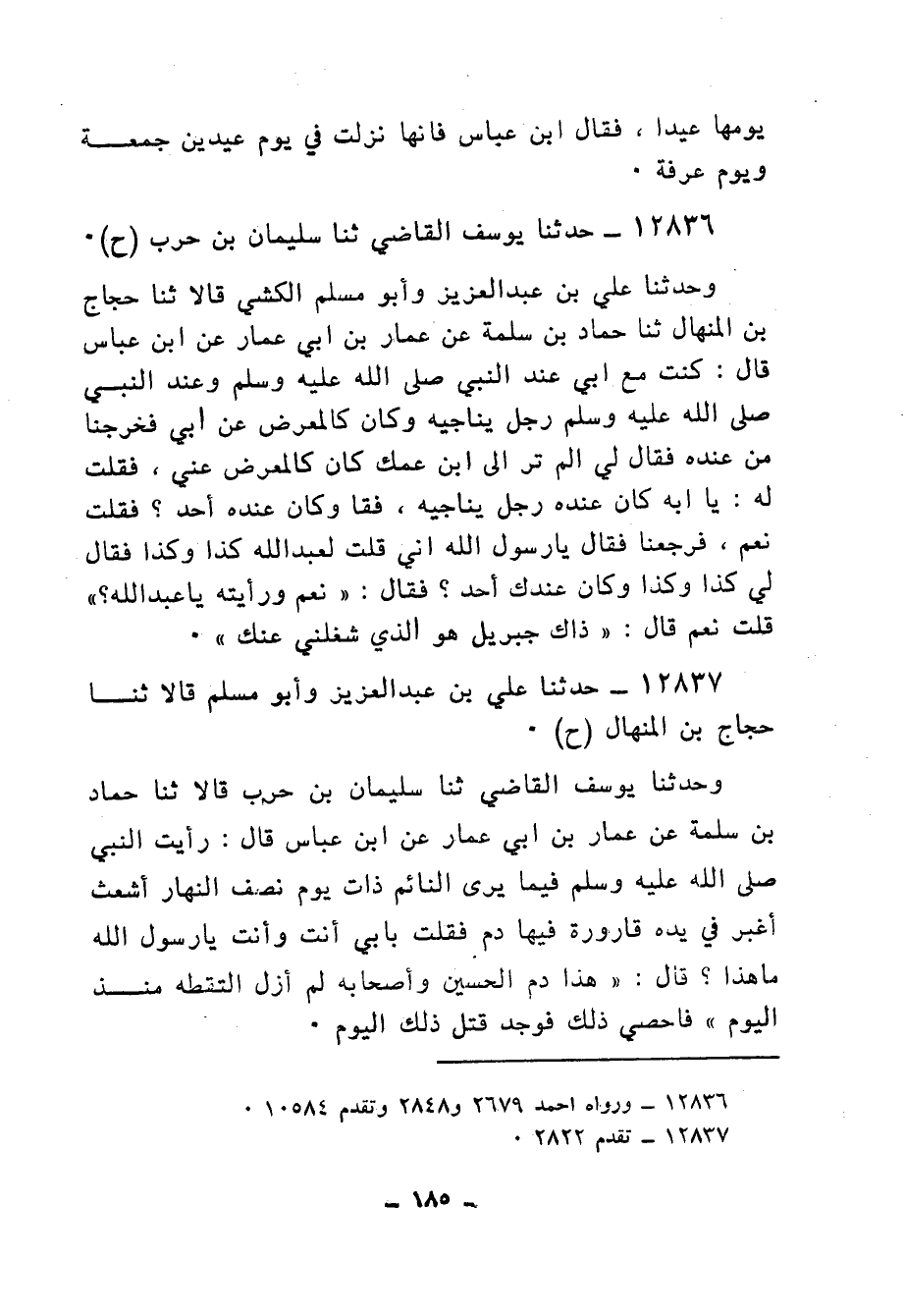 12837 - حَدَّثَنَا عَلِيُّ بْنُ عَبْدِ الْعَزِيزِ، وَأَبُو مُسْلِمٍ، قَالَا: ثنا حَجَّاجُ بْنُ الْمِنْهَالِ، ح وَحَدَّثَنَا يُوسُفُ الْقَاضِي، ثنا سُلَيْمَانُ بْنُ حَرْبٍ، قَالَا: ثنا حَمَّادُ بْنُ سَلَمَةَ، عَنْ عَمَّارِ بْنِ أَبِي عَمَّارٍ، عَنِ ابْنِ عَبَّاسٍ قَالَ: رَأَيْتُ النَّبِيَّ صَلَّى اللهُ عَلَيْهِ وَسَلَّمَ فِيمَا يَرَى النَّائِمُ ذَاتَ يَوْمٍ نِصْفَ النَّهَارِ أَشْعَثَ أَغْبَرَ فِي يَدِهِ قَارُورَةٌ فِيهَا دَمٌ، فَقُلْتُ: بِأَبِي أَنْتَ وَأُمِّي يَا رَسُولَ اللهِ مَا هَذِهِ؟ قَالَ: «§هَذَا دَمُ الْحُسَيْنِ، وَأَصْحَابِهِ لَمْ أَزَلْ أَلْتَقِطُهُ مُنْذُ الْيَوْمِ» ، فَأُحْصِيَ ذَلِكَ فَوُجِدَ قُتِلَ ذَلِكَ الْيَوْمَ