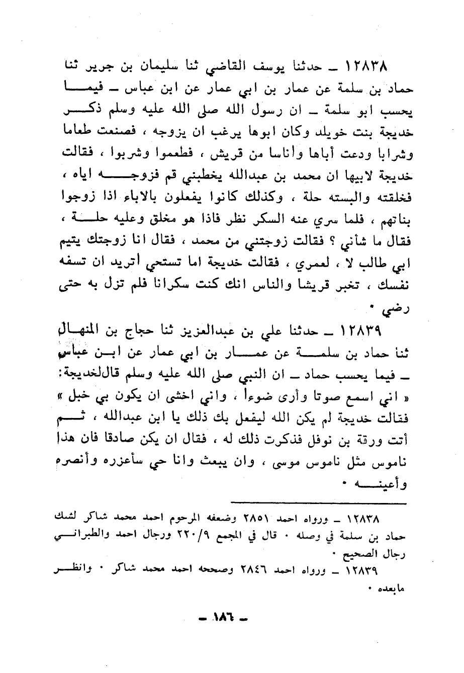 12839 - حَدَّثَنَا عَلِيُّ بْنُ عَبْدِ الْعَزِيزِ، ثنا حَجَّاجُ بْنُ الْمِنْهَالِ، ثنا حَمَّادُ بْنُ سَلَمَةَ، عَنْ عَمَّارِ بْنِ أَبِي عَمَّارٍ، عَنِ ابْنِ عَبَّاسٍ، فِيمَا يَحْسَبُ حَمَّادٌ أَنَّ النَّبِيَّ صَلَّى اللهُ عَلَيْهِ وَسَلَّمَ قَالَ لِخَدِيجَةَ: «§إِنِّي أَسْمَعُ صَوْتًا، وَأَرَى ضَوْءًا، وَإِنِّي أَخْشَى أَنْ يَكُونَ بِي خَبَلٌ» ، فَقَالَتْ خَدِيجَةُ: لَمْ يَكُنِ اللهُ لِيَفْعَلَ بِكَ ذَلِكَ يَا ابْنَ عَبْدِ اللهِ. ثُمَّ أَتَتْ وَرَقَةَ بْنَ نَوْفَلٍ فَذَكَرَتْ ذَلِكَ لَهُ، فَقَالَ: إِنْ يَكُنْ صَادِقًا فَإِنَّ هَذَا نَامُوسٌ مِثْلُ نَامُوسِ مُوسَى، وَإِنْ يُبْعَثْ، وَأَنَا حَيٌّ سَأُعَزِّرُهُ، وَأَنْصُرُهُ، وَأُعِينُهُ