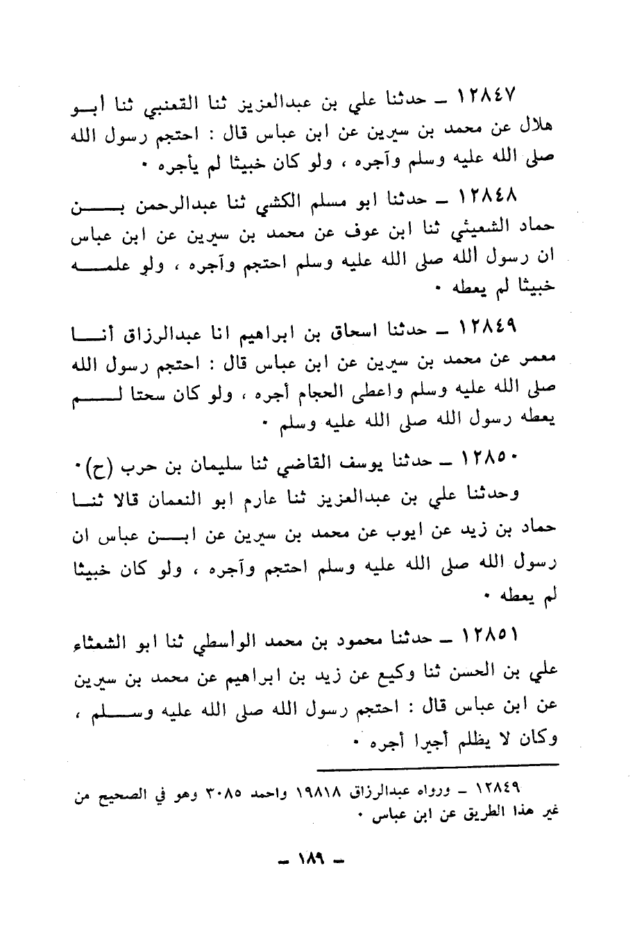 12849 - حَدَّثَنَا إِسْحَاقُ بْنُ إِبْرَاهِيمَ، أنا عَبْدُ الرَّزَّاقِ، أنا مَعْمَرٌ، عَنْ أَيُّوبَ، عَنْ مُحَمَّدِ بْنِ سِيرِينَ، عَنِ ابْنِ عَبَّاسٍ، قَالَ: «§احْتَجَمَ رَسُولُ اللهِ صَلَّى اللهُ عَلَيْهِ وَسَلَّمَ، وَأَعْطَى الْحَجَّامَ أَجْرَهُ، وَلَوْ كَانَ سُحْتًا لَمْ يُعْطِهِ رَسُولُ اللهِ صَلَّى اللهُ عَلَيْهِ وَسَلَّمَ»