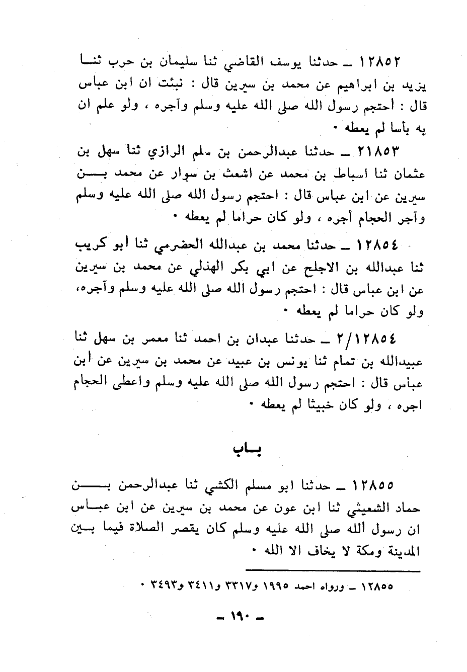 12852 - حَدَّثَنَا يُوسُفُ الْقَاضِي، ثنا سُلَيْمَانُ بْنُ حَرْبٍ، ثنا يَزِيدُ بْنُ إِبْرَاهِيمَ، عَنْ مُحَمَّدِ بْنِ سِيرِينَ، قَالَ: نُبِّئْتُ أَنَّ ابْنَ عَبَّاسٍ، قَالَ: «§احْتَجَمَ رَسُولُ اللهِ صَلَّى اللهُ عَلَيْهِ وَسَلَّمَ، وَآجَرَهُ، وَلَوْ عَلِمَ أَنَّ بِهِ بَأْسًا لَمْ يُعْطِهِ»