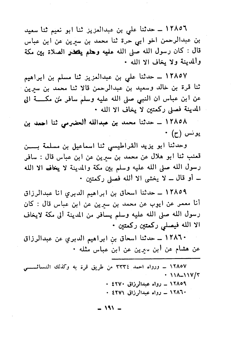 12859 - حَدَّثَنَا إِسْحَاقُ بْنُ إِبْرَاهِيمَ الدَّبَرِيُّ، أنا عَبْدُ الرَّزَّاقِ، أنا مَعْمَرٌ، عَنْ أَيُّوبَ، عَنْ مُحَمَّدِ بْنِ سِيرِينَ، عَنِ ابْنِ عَبَّاسٍ، قَالَ: «كَانَ رَسُولُ اللهِ صَلَّى اللهُ عَلَيْهِ وَسَلَّمَ §يُسَافِرُ مِنَ الْمَدِينَةِ إِلَى مَكَّةَ لَا يَخَافُ إِلَّا اللهَ فَيُصَلِّي رَكْعَتَيْنِ رَكْعَتَيْنِ» ،