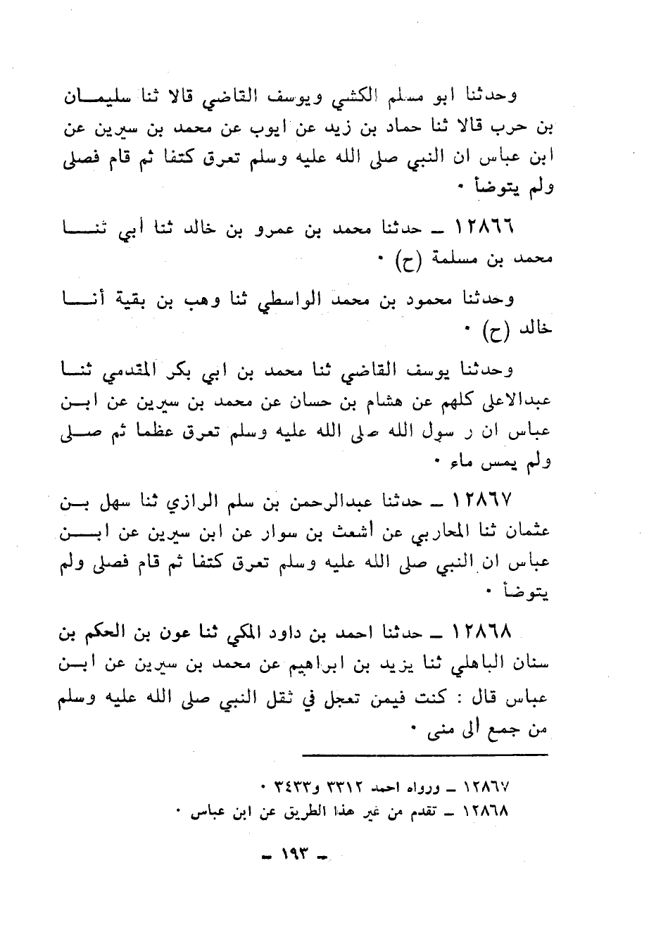 12866 - حَدَّثَنَا مُحَمَّدُ بْنُ عَمْرِو بْنِ خَالِدٍ، ثنا أَبِي، ثنا مُحَمَّدُ بْنُ مَسْلَمَةَ، ح وَحَدَّثَنَا مَحْمُودُ بْنُ مُحَمَّدٍ الْوَاسِطِيُّ، ثنا وَهْبُ بْنُ بَقِيَّةَ، أنا خَالِدٌ، ح وَحَدَّثَنَا يُوسُفُ الْقَاضِي، ثنا مُحَمَّدُ بْنُ أَبِي بَكْرٍ الْمُقَدَّمِيُّ، ثنا عَبْدُ الْأَعْلَى، كُلُّهُمْ، عَنْ هِشَامِ بْنِ حَسَّانَ، عَنْ مُحَمَّدِ بْنِ سِيرِينَ، عَنِ ابْنِ عَبَّاسٍ: «أَنَّ رَسُولَ اللهِ صَلَّى اللهُ عَلَيْهِ وَسَلَّمَ §تَعَرَّقَ عَظْمًا ثُمَّ صَلَّى وَلَمْ يَمَسَّ مَاءً»